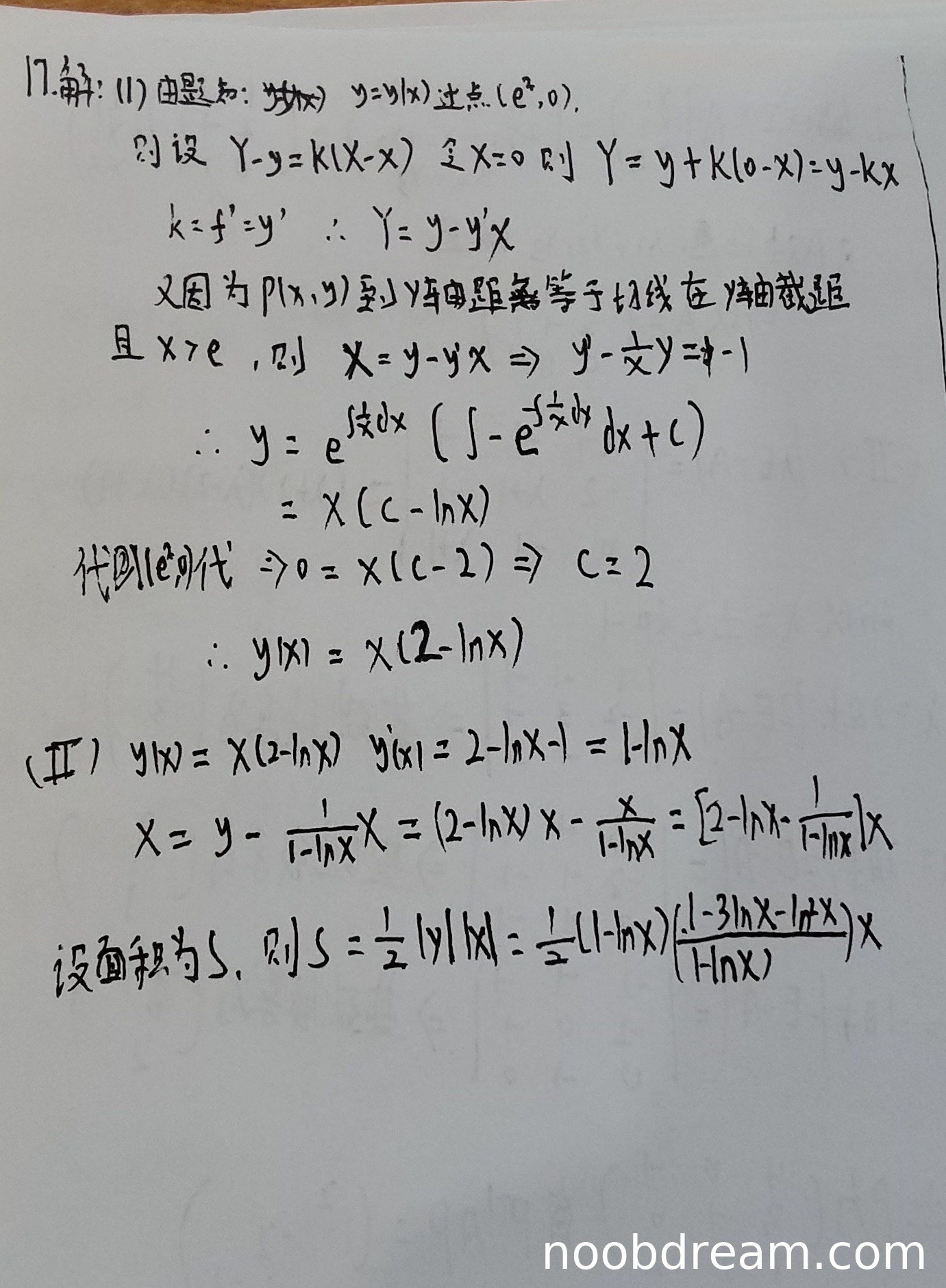 学生正确建立了微分方程 \(x = y - xy'\),并转化为一阶线性方程 \(y' - \frac{1}{x}y = -1\),求解得到通解 \(y = x(C - \ln x)\),再利用初始条件 \(y(e^2)=0\) 确定常数 \(C=2\),最终得到正确结果 \(y(x) = x(2 - \ln x)\)。过程清晰,计算正确。虽然第一次识别中“代回 \((e^{2},0)\) 得 \(0=x(c - 2)\)” 写成了 \(x\) 而不是 \(e^2\),但第二次识别中已更正为 \(0 = e^{2}(C - 2)\),且不影响最终结果,可视为识别误差。因此,本小题得满分5分。