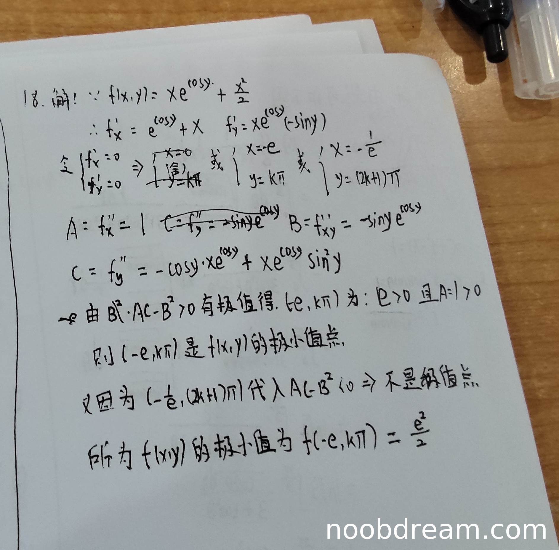 - 驻点求解错误:学生列出了 \((0, k\pi)\) 为驻点,但代入 \(f_y' = -x \sin y e^{\cos y}\),当 \(x=0\) 时,\(f_y' \equiv 0\) 恒成立,但代入 \(f_x' = e^{\cos y}+0 = e^{\cos y} \neq 0\),因此 \((0, k\pi)\) 不是驻点。这是一个关键的逻辑错误,扣2分。