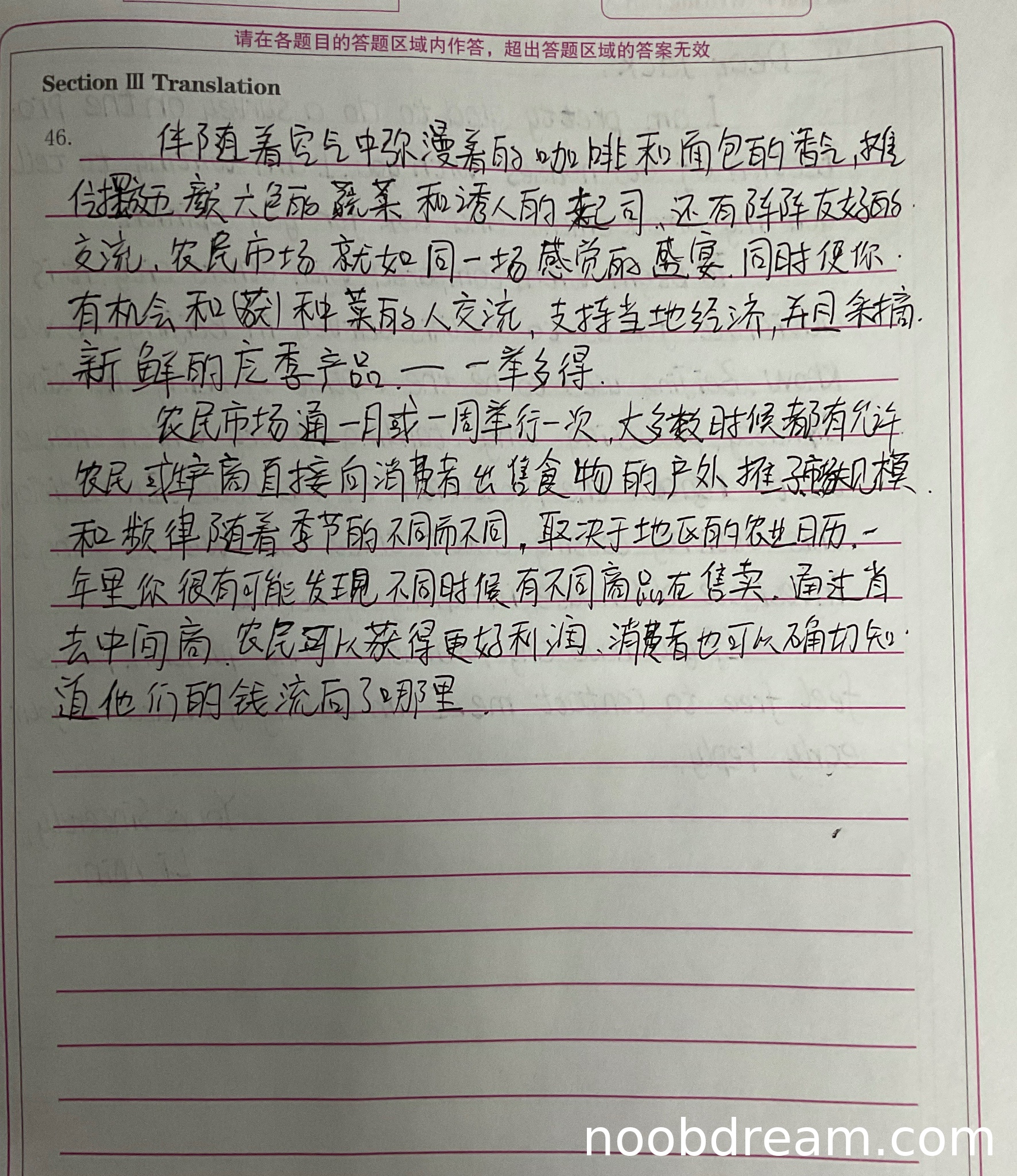 评分分析:学生译文完整涵盖了“与种植者交流”、“支持当地经济”、“获取新鲜时令产品”三个要点,并将“all at the same time”意译为“一举多得”,准确且简洁。“pick up”译为“采摘”在农贸市场语境下可以接受(指挑选购买),与“购买”无本质逻辑冲突。得3分。