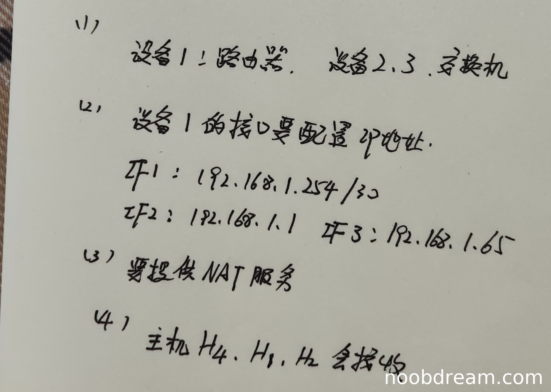 学生答案正确指出只有设备1(路由器)的接口需要配置IP地址。给出的三个接口IP地址(192.168.1.254, 192.168.1.1, 192.168.1.65)与标准答案一致。