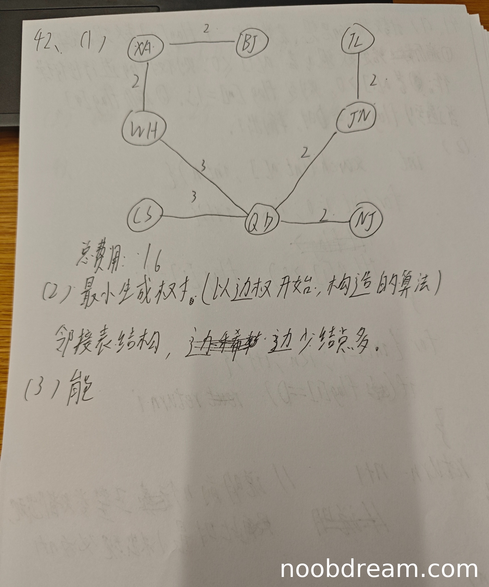 学生给出了总费用为16,这与标准答案中两种最小生成树方案的总费用一致。但是,学生没有给出具体的最小生成树方案(即用带权图表示或列出所选边),只给出了总费用。根据题目要求“给出所有可能的最经济的光缆铺设方案(用带权图表示),并计算相应方案的总费用”,学生仅完成了计算总费用的部分,未展示方案图或边列表。因此,不能给满分。扣2分。得2分。