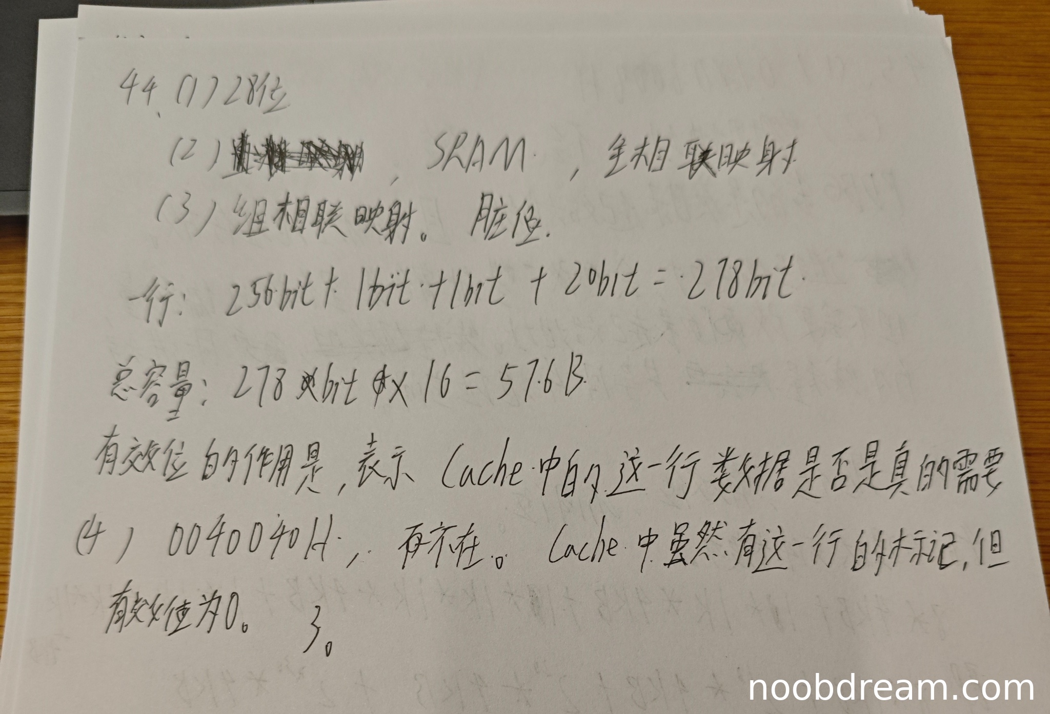 第一问“组相联映射”正确。第二问只答了“脏位”,标准答案要求有“替换算法控制位和一致性维护位”,脏位属于一致性维护位,但缺少替换算法控制位(如LRU位),回答不完整。第三问计算Cache总容量,学生计算为576B,但标准答案为558字节。其计算过程(278bit×16)思路正确,但单位换算有误(278bit应为278位,即34.75字节,乘以16行得到556字节,而非576B),且未考虑组数(8组,每组2行,共16行)和具体附加位导致的容量差异,结果错误。第四问“有效位的作用”回答基本正确。综合来看,第一问和第四问正确,第二问不完整,第三问计算错误。第一问得1分,第二问得0.5分(部分正确),第三问得0分,第四问得1分。本小题总计得2.5分,按整数计分原则,扣分后得2分。