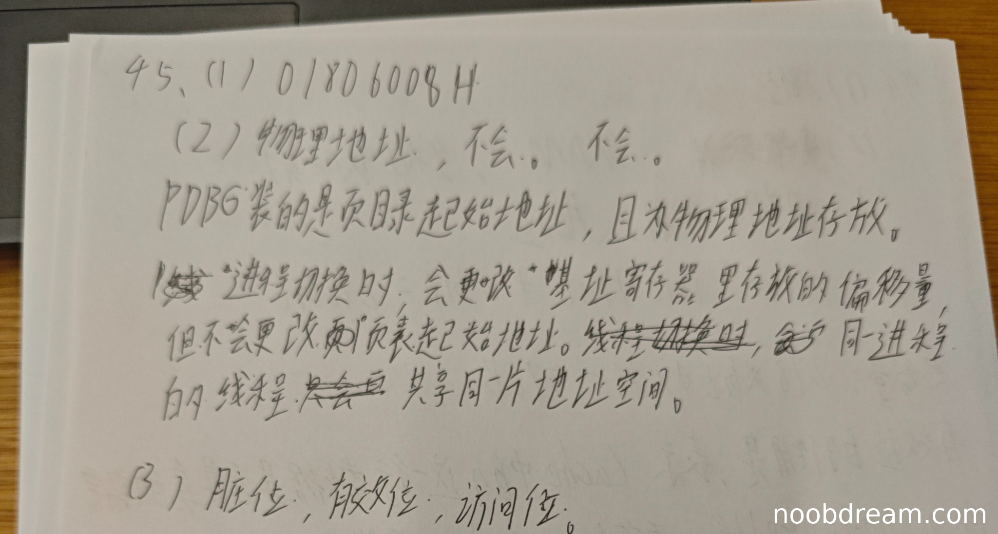 第二问:学生回答“不会”,并解释“进程切换时,会更改基址寄存器里存放的偏移量,但不会更改页表起始地址”。此解释存在逻辑错误。标准答案明确指出,进程切换时,地址空间和页目录发生变化,因此保存页目录起始物理地址的PDBR(学生作答中误写为PDBG,根据禁止扣分原则第1条,不扣分)内容必须改变。学生认为“不会更改页表起始地址”是错误的,此处应扣分。第二问得0分。