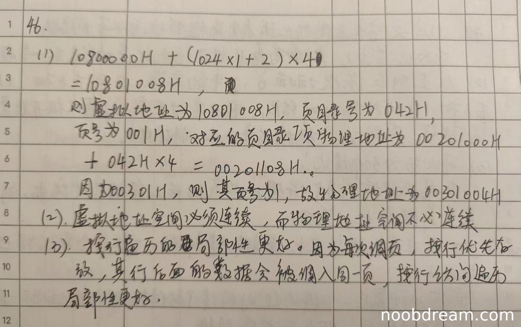- 页目录号(042H)和页号(001H)正确,得1分。