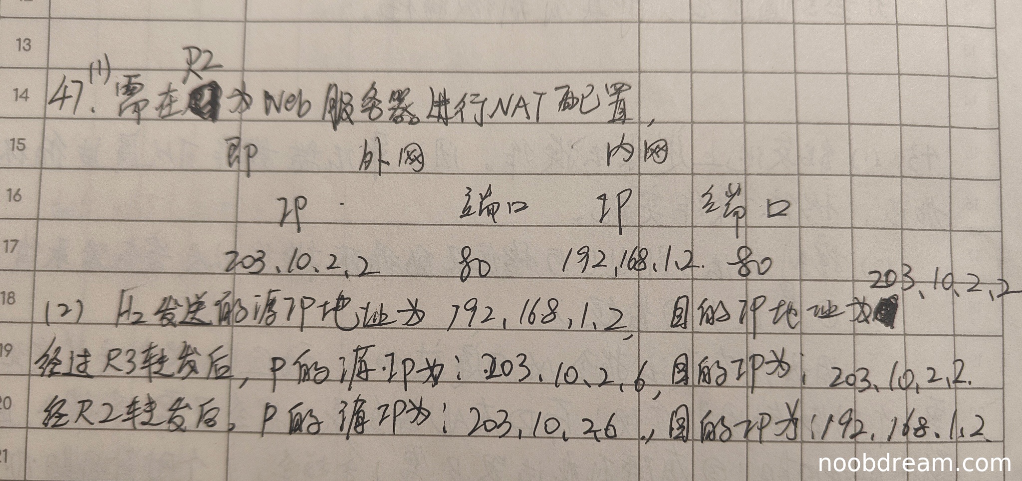 ② 经过R3转发后:学生正确给出了源IP(203.10.2.6)和目的IP(203.10.2.2)。这与标准答案一致,说明学生理解R3作为NAT设备进行了源地址转换。