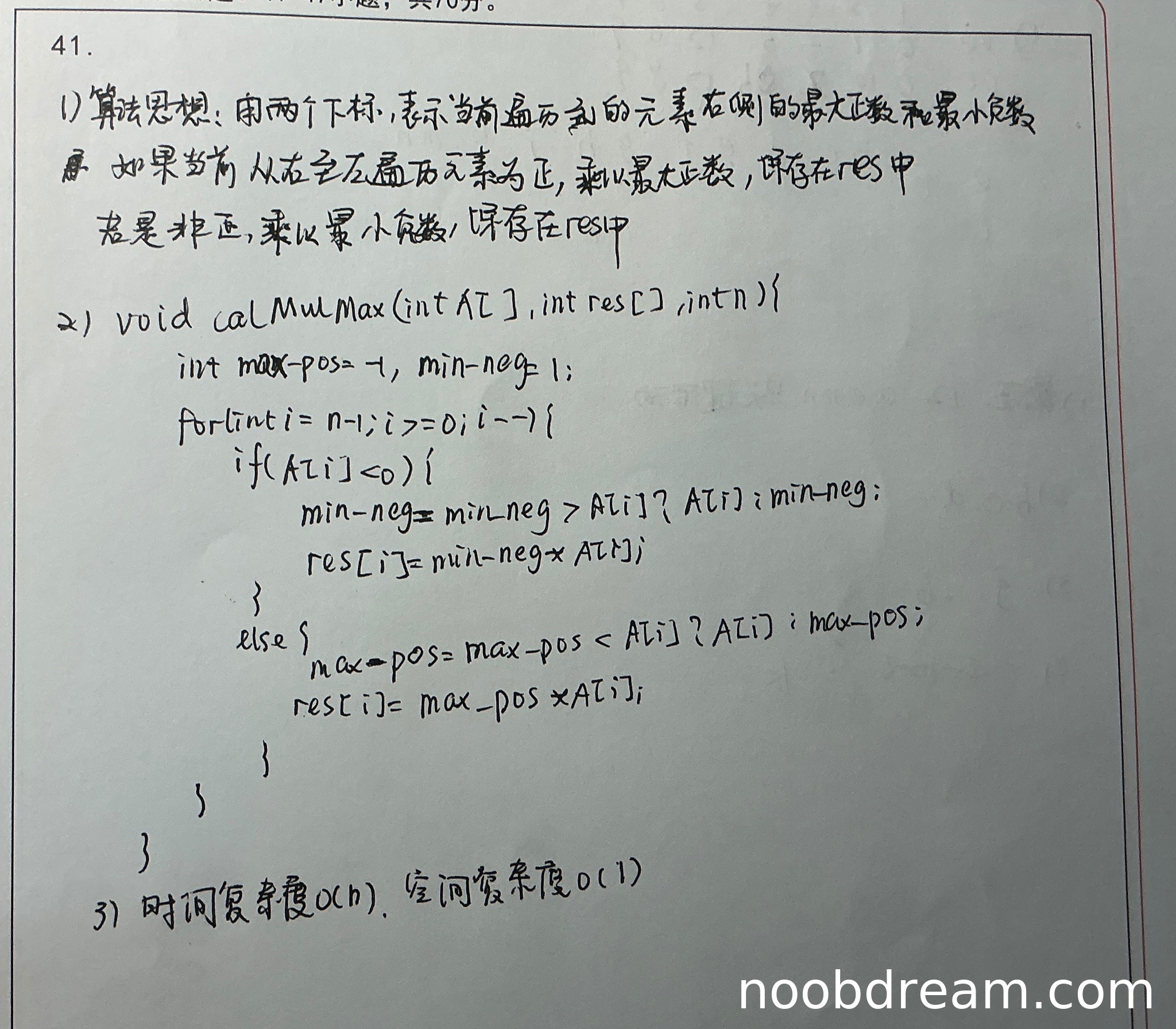 理由:学生的基本设计思想与标准答案有差异。标准答案的核心是维护右侧子数组的全局最大值和最小值,然后根据当前元素的正负性选择与之相乘的值。学生的思路是维护“右侧的最大正数和最小负数”,这是一个不完整的逻辑。因为当右侧子数组中同时存在正数和负数时,一个负数乘以右侧的最小负数(即最负的数)可能得到最大乘积(正数),但学生只考虑了“最小负数”,而忽略了负数也可能需要乘以右侧的最大值(如果右侧最大值是正数,乘积为负,可能不是最大;但如果右侧最大值是负数且绝对值较小,乘积可能更大)。此外,对于正数元素,学生只考虑乘以“最大正数”,但若右侧没有正数(全为负数或零),则最大正数不存在(初始值可能不合适),此时正数乘以右侧的负数可能得到更小的乘积,而实际上正数应该乘以右侧的最大值(可能是负数)才能得到最大乘积?这里逻辑有误。因此,设计思想存在缺陷,扣2分。