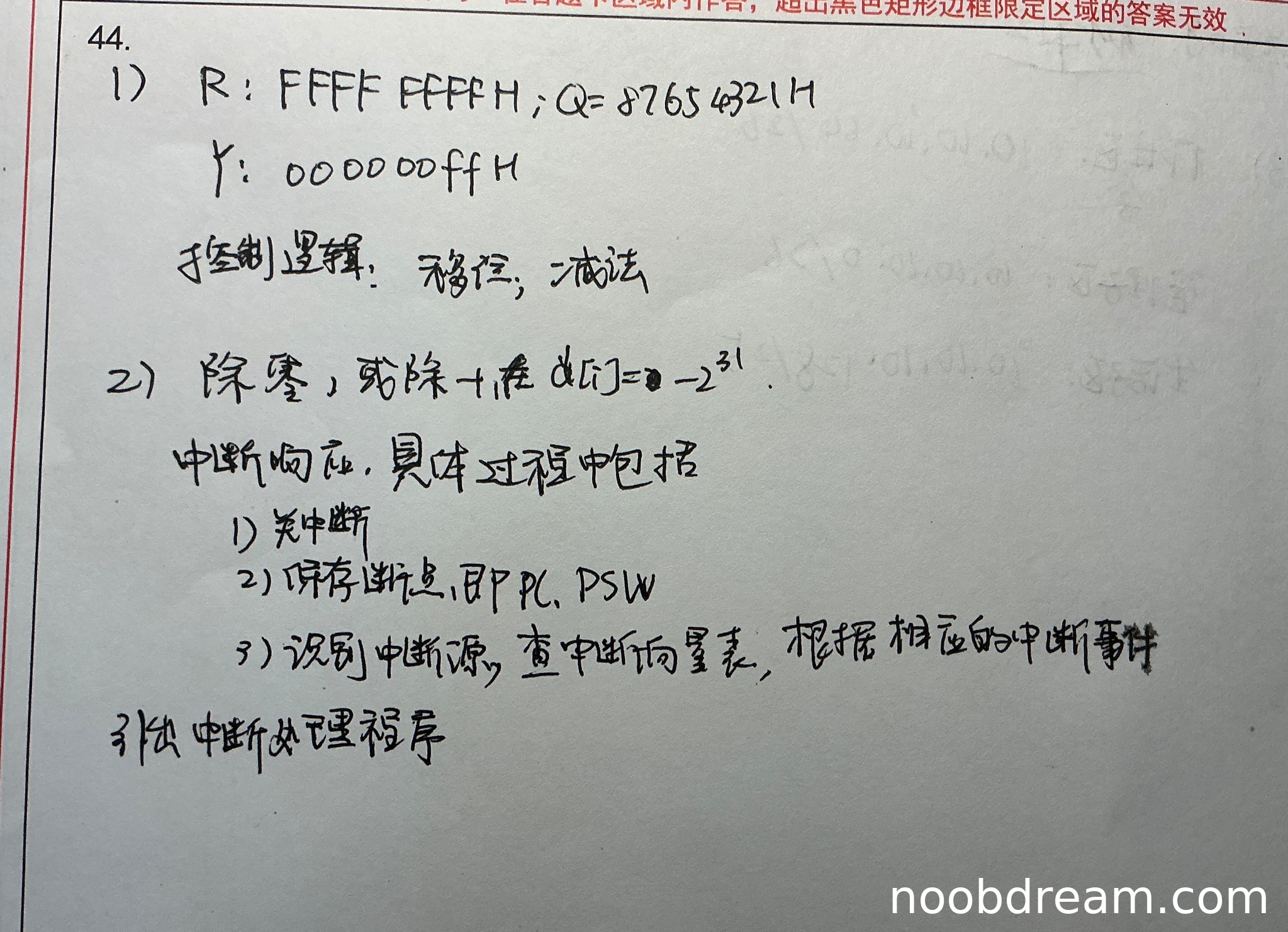- 除法异常情况:提到了“除零”和“除十使 d[门]= -2³¹”(识别可能为“除数为-1时 d[i]= -2³¹”)。标准答案包括除数为0和溢出(d[i]=0x80000000且x=0xffffffff)两种情况。学生提到了除零正确,但第二种情况描述不清晰(“除十”可能为识别错误,意图可能是“除数为-1”),且未明确给出x的十六进制值。此处部分正确。