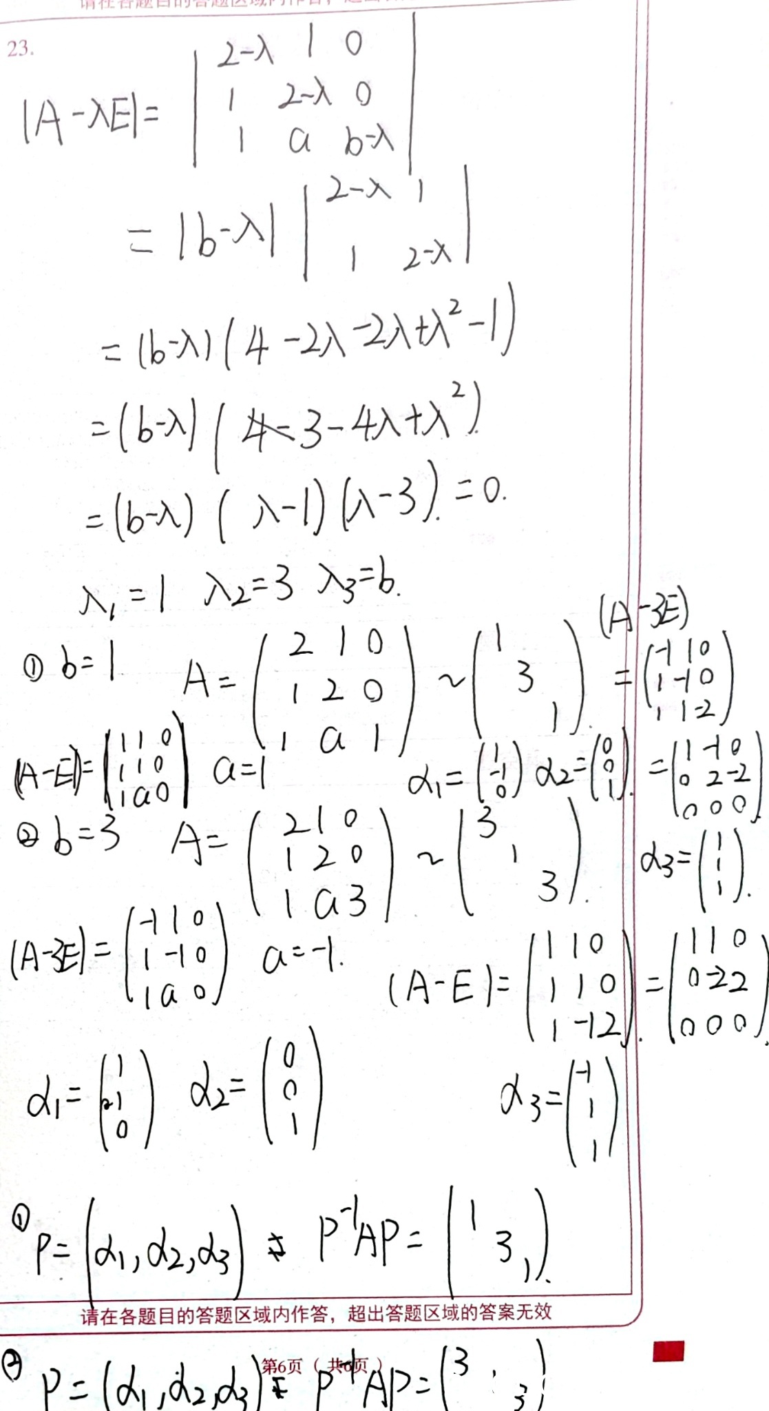 学生给出了两种情况下特征向量的求解思路和结果,并指出 P 由特征向量构成,P⁻¹AP 为对角阵。但在具体表述和最终结果的对角矩阵元素排列上存在一些混乱和笔误(例如第一次识别结果中,对角矩阵的写法不规范且有明显错误;第二次识别结果中,b=3 情况下的特征向量 α₁, α₂ 与标准答案不同,且对角矩阵的写法也不规范)。这些属于表述和细节错误,但核心逻辑(用特征向量构造 P)是正确的。考虑到题目要求“求可逆矩阵 P,使 P⁻¹AP 为对角矩阵”,学生给出了正确的构造方法和特征向量(尽管第二次识别中 b=3 时的 α₂ 与标准答案不同,但计算出的向量 (-1,0,1)ᵀ 确实是 (E-A)x=0 的解,是有效的特征向量,可以构成 P),因此扣1分。得4分。