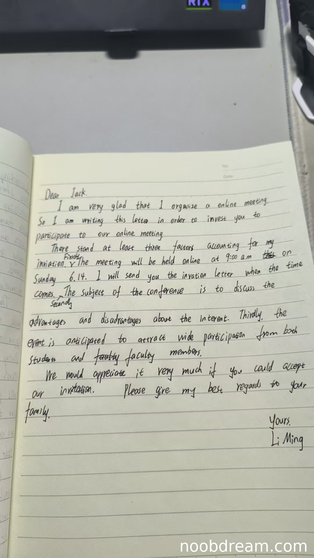 - 语言表达:整体语言流畅,能够清晰传达信息。存在少量语法和用词问题,例如“I organize”应使用现在进行时“am organizing”或将来时更佳;“There stand at least three factors accounting for my invitation”句式略显生硬和正式,与邮件语域不完全匹配;“6.14”日期格式不标准,应为“June 14th”或“14th June”。但这些错误不影响核心理解。