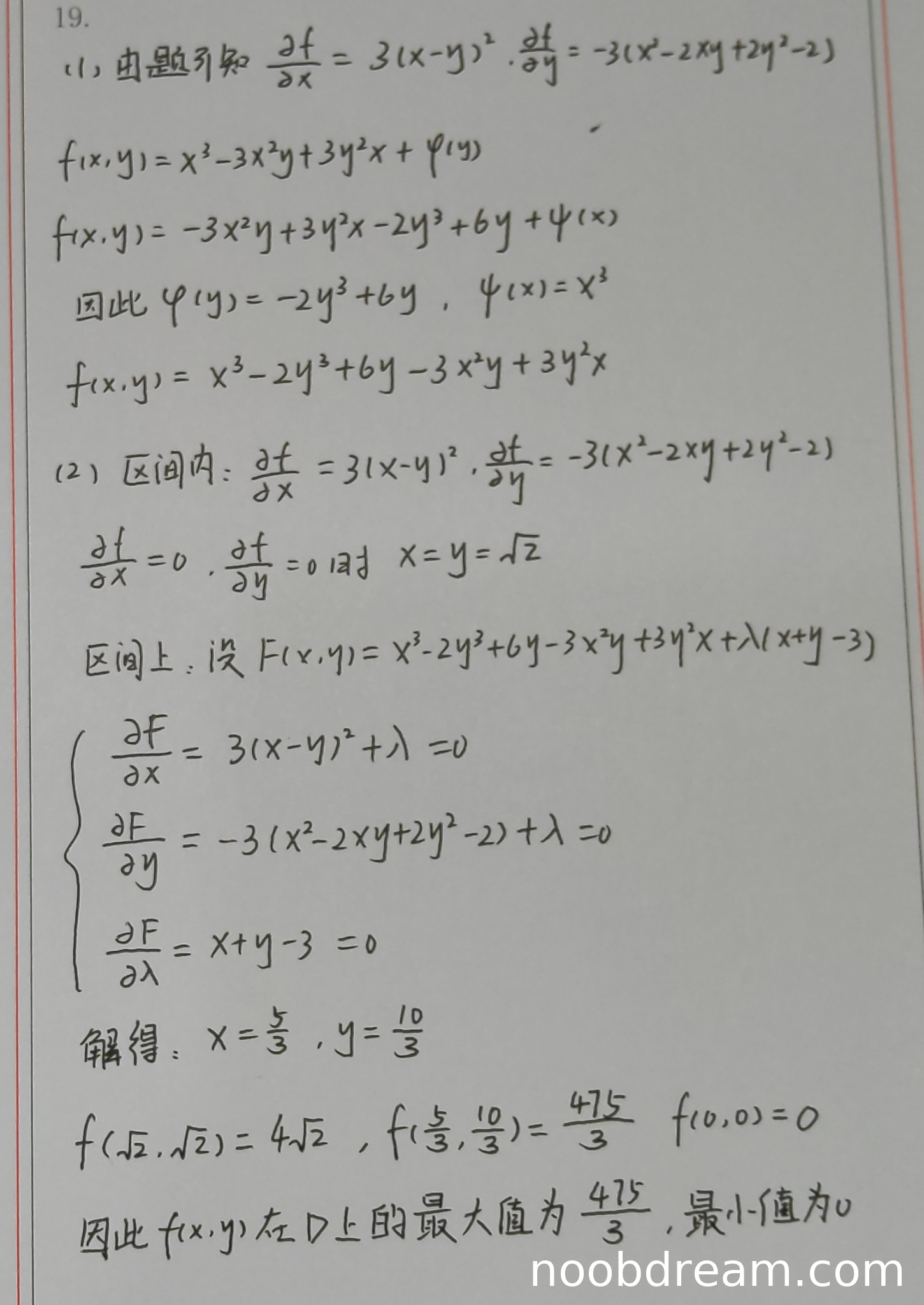 学生正确求出区域内驻点 \((\sqrt{2},\sqrt{2})\),并计算函数值 \(4\sqrt{2}\)。但在边界 \(L_3: x+y=3\) 上,使用拉格朗日乘数法时,解方程出现错误:由方程组消去 \(\lambda\) 后应得 \(3(x-y)^2 = -3(x^2-2xy+2y^2-2)\),代入 \(y=3-x\) 求解,但学生得到 \(x=\frac{5}{3}, y=\frac{10}{3}\),该点不满足 \(x+y=3\)(因为 \(\frac{5}{3}+\frac{10}{3}=5 \neq 3\)),且计算 \(f(\frac{5}{3},\frac{10}{3})=\frac{475}{3}\) 有误(实际代入正确表达式应得负值)。此外,学生遗漏了边界 \(L_1\)(\(x=0\))、\(L_2\)(\(y=0\))上的驻点及端点 \((0,3),(3,0)\) 的考察,导致最值判断错误(最大最小值均错)。因此,本部分存在严重逻辑错误和计算错误,扣分较多。但考虑到正确求出了区域内驻点并计算了其函数值,给予部分步骤分。扣4分,得2分。