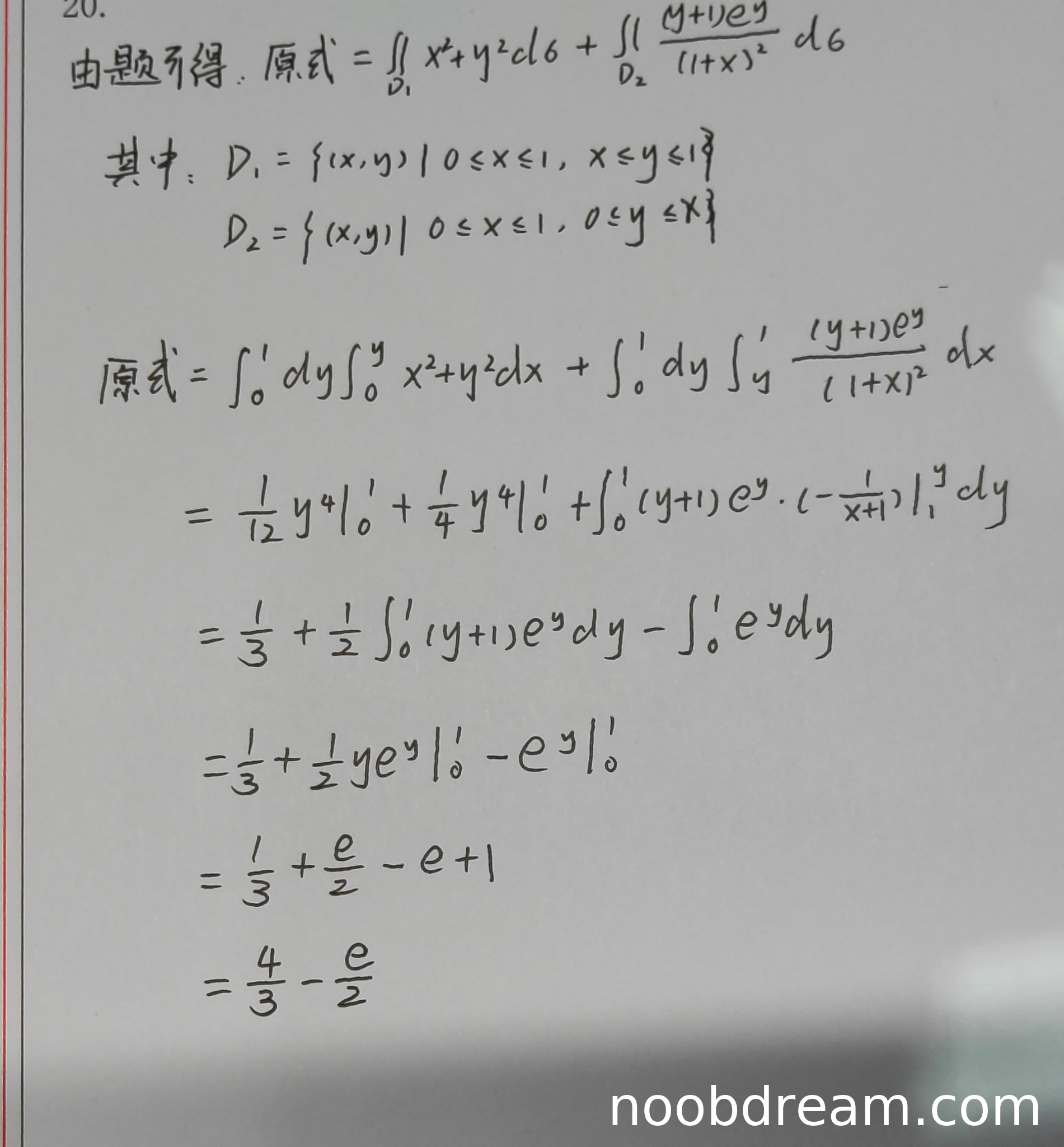 学生作答存在关键逻辑错误:将两个积分区域对应的函数表达式弄反了。题目中当 \(y < x\) 时使用 \(\frac{(y+1)e^y}{(1+x)^2}\),当 \(y \geqslant x\) 时使用 \(x^2 + y^2\)。而学生在第一次和第二次识别结果中均将 \(D_1\) 定义为 \(x \leq y \leq 1\)(即 \(y \geq x\)),却对 \(D_1\) 使用了 \(x^2 + y^2\),对 \(D_2\) 使用了 \(\frac{(y+1)e^y}{(1+x)^2}\),这恰好与题目定义相反。因此,整个积分计算的基础是错误的,后续计算即使过程正确,也是基于错误的分区表达式进行的,属于严重的逻辑错误。