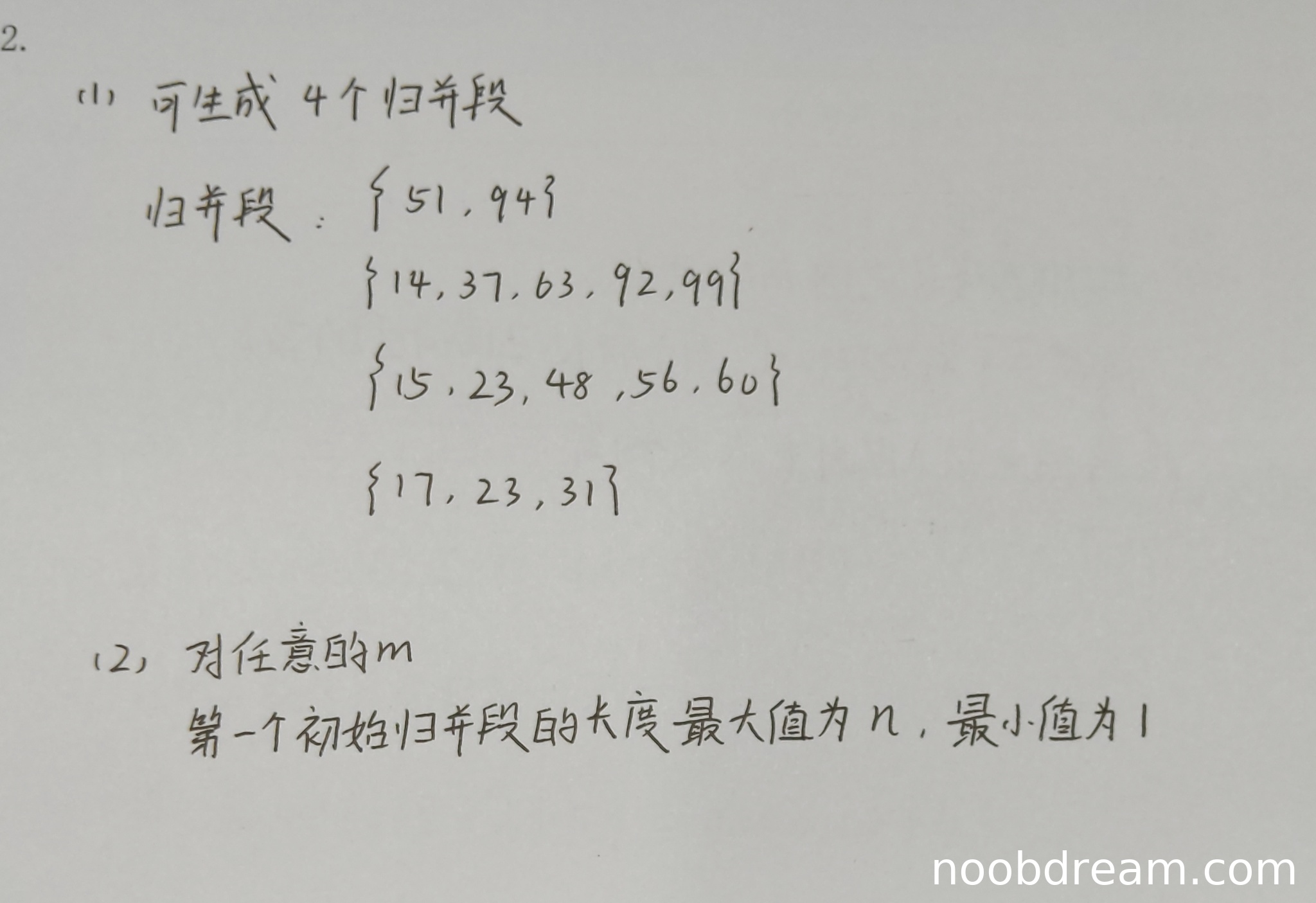学生回答生成4个归并段,与标准答案(3个)不符。给出的具体归并段内容也与标准答案完全不同,且存在明显逻辑错误(如归并段内无序、重复出现23、未包含所有记录等)。这表明学生未能正确理解置换-选择排序算法。因此,本题不得分。
