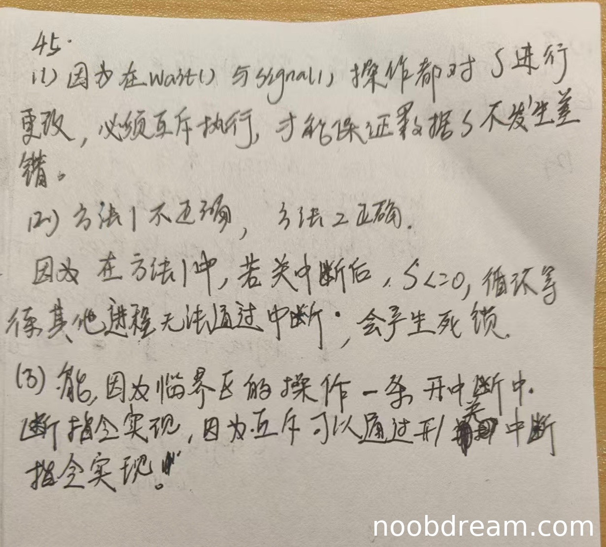 学生正确判断了“方法1不正确,方法2正确”。对于方法1不正确的理由,学生提到“若关中断后,S<=0,循环等待其他进程无法通过中断,会产生死锁”。这里的“死锁”表述不够精确(更准确的说法是“死循环”或“忙等待且无法被调度”),但核心逻辑正确,即关中断状态下其他进程无法运行来修改S,导致循环无法退出。因此不扣分。得3分。