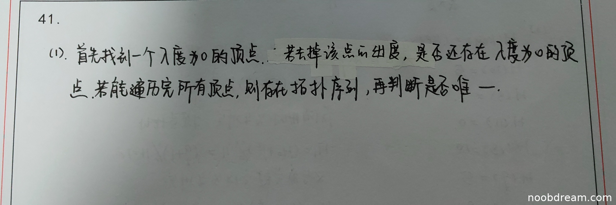 理由:学生的基本设计思想提到了“找到一个入度为0的顶点,若去掉该点的出度,是否还存在入度为0的顶点,若能遍历完所有顶点,则存在拓扑序列”,这描述了拓扑排序的基本过程。但是,对于“再判断是否唯一”这一关键点,学生没有给出具体的判断方法(例如,在每一步中是否只能有一个入度为0的顶点)。因此,思路不完整,扣2分。