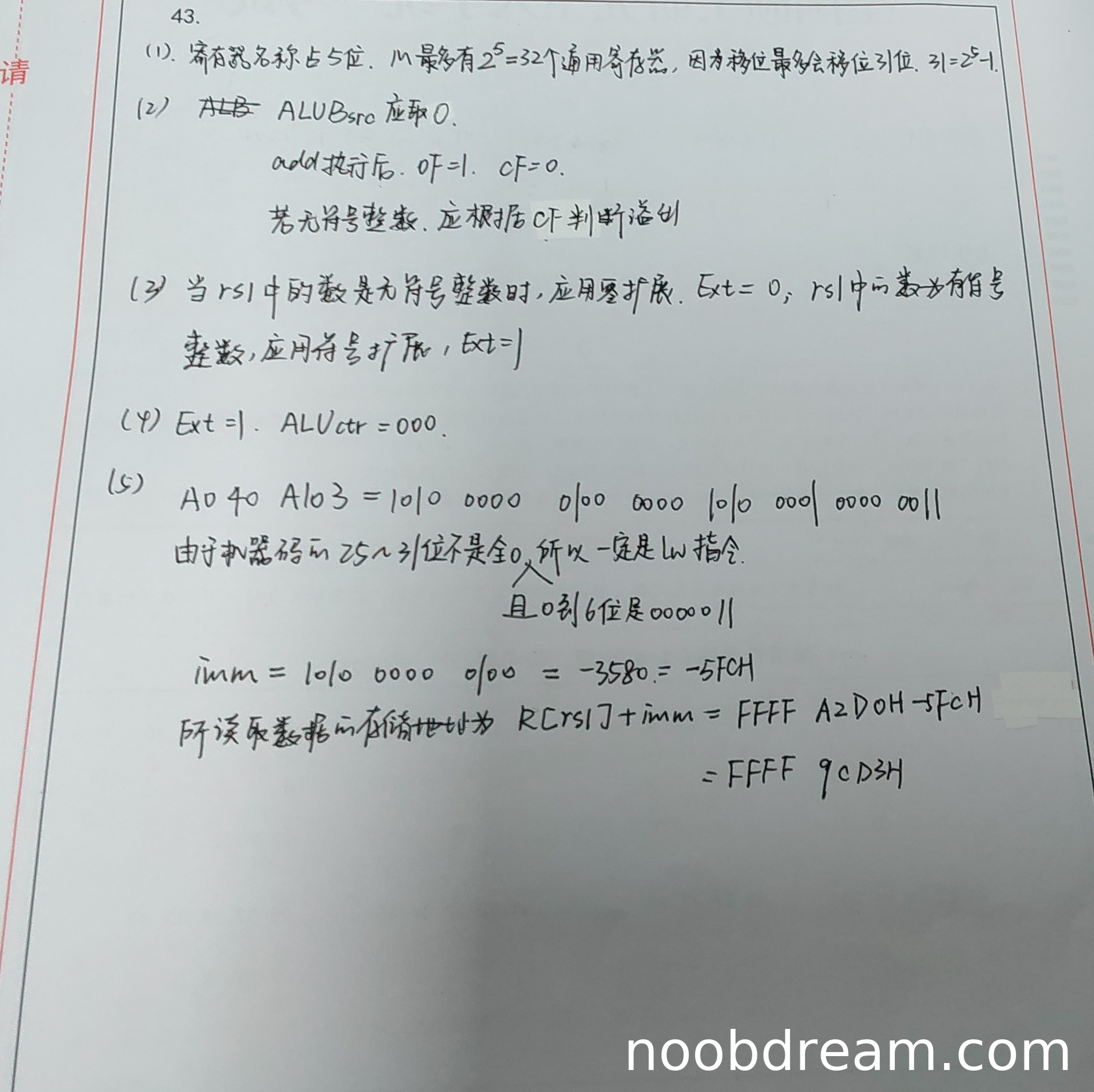 学生回答:ALUBsrc应取0,正确。但后续计算与标志位判断有误: