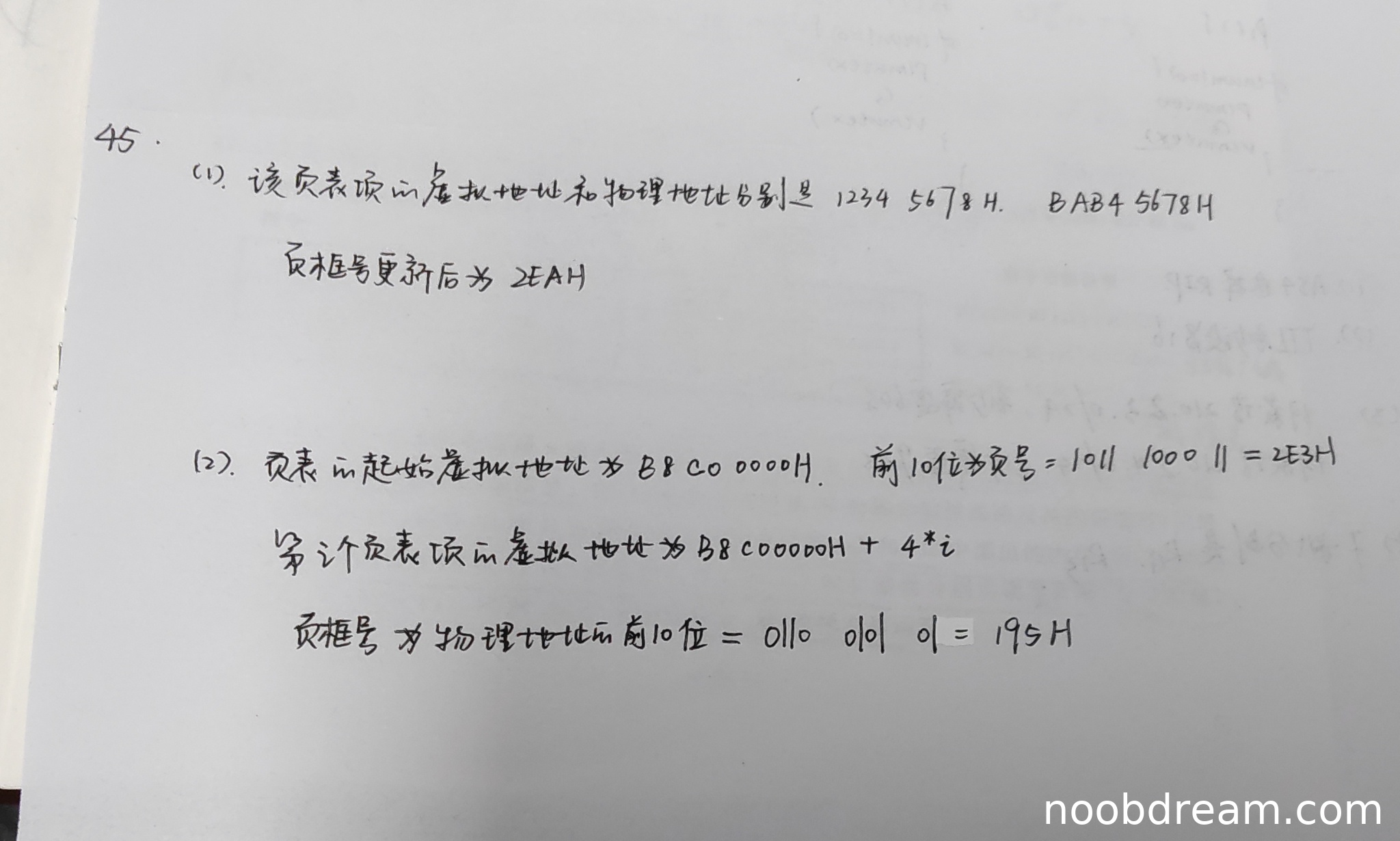 学生两次识别结果均正确计算出了页号(2E3H),并给出了计算页表项虚拟地址的公式(B8C00000H + 4*i),以及页框号(195H)。虽然学生没有明确写出“该页对应的页表项的虚拟地址”的具体数值(应为B8C0 0B8CH),但给出了正确的计算方法(4*i),且页框号计算正确。根据“思路正确不扣分”的原则,此处不扣分。页框号195H计算正确。