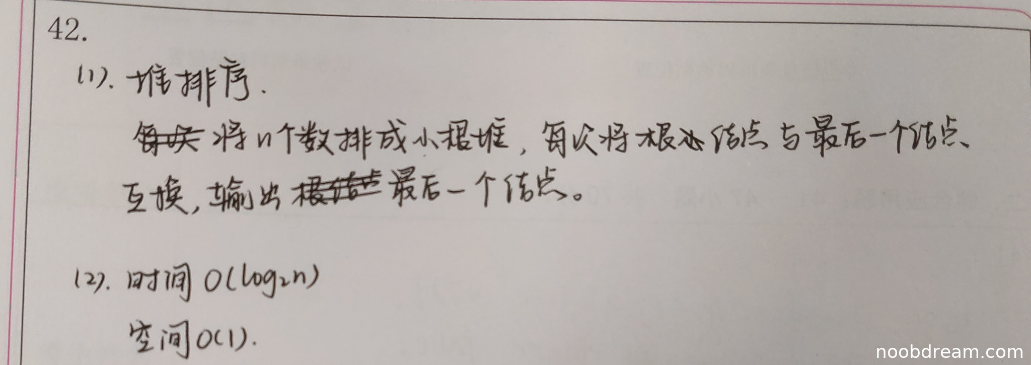 学生答案第二问给出的时间复杂度为O(log₂n),空间复杂度为O(1)。时间复杂度分析存在严重逻辑错误。无论是使用完整的堆排序还是使用大小为k的堆来维护最小k个数,时间复杂度都不可能是O(log n)。对于本问题,使用堆的合理时间复杂度应为O(n log k) ≈ O(n)(因为k=10是常数),而学生给出的O(log n)远小于实际所需时间,属于错误分析。空间复杂度O(1)正确,因为可以原地操作。