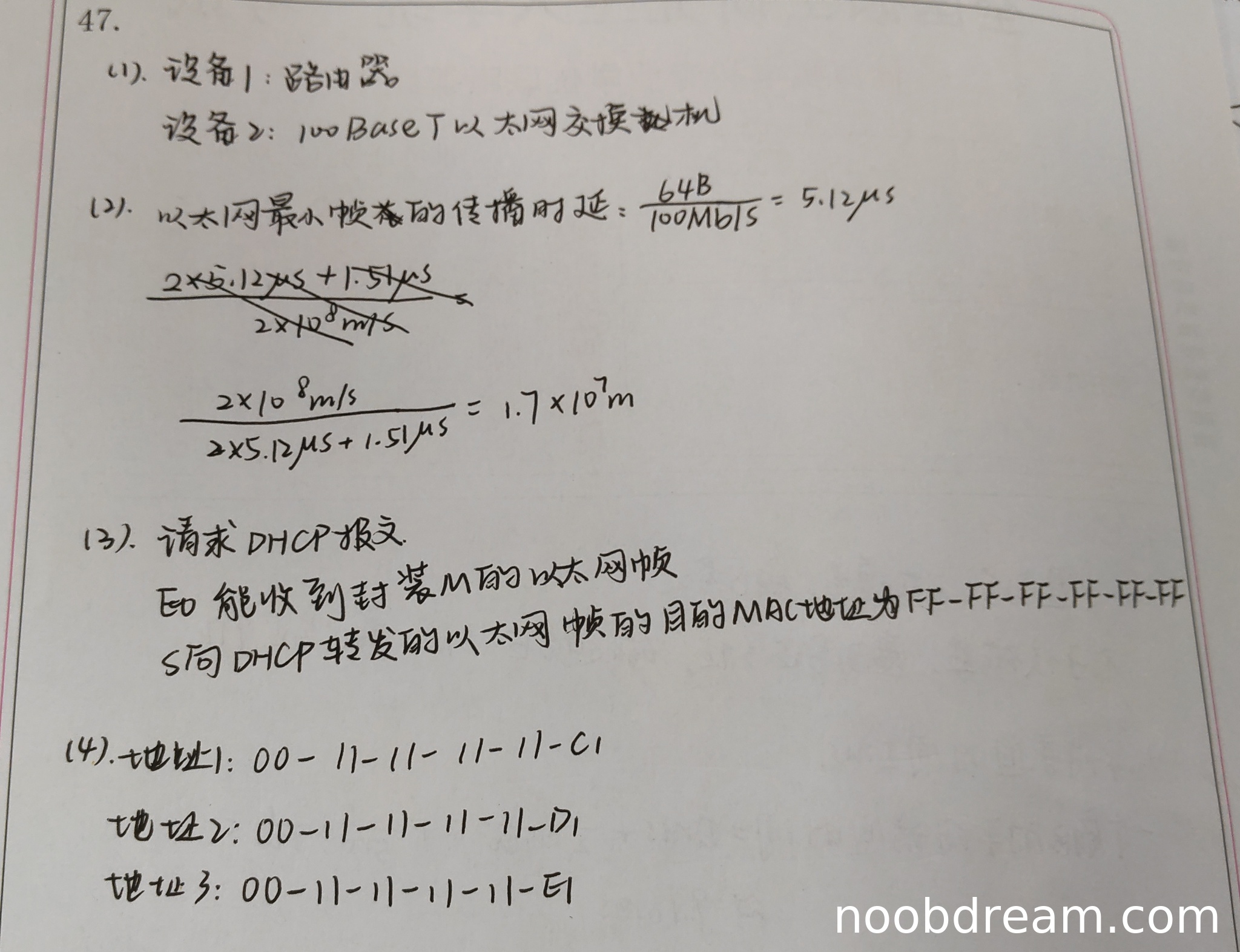 学生答案计算过程混乱,公式使用错误,最终结果错误。标准答案应基于CSMA/CD最短帧长公式:最短帧长 = (总传播时延) × 数据传输速率 × 2。学生错误地计算了传播时延,且未正确代入额外延迟和距离关系,得出错误距离1.7×10^7 m。逻辑错误,扣1分。