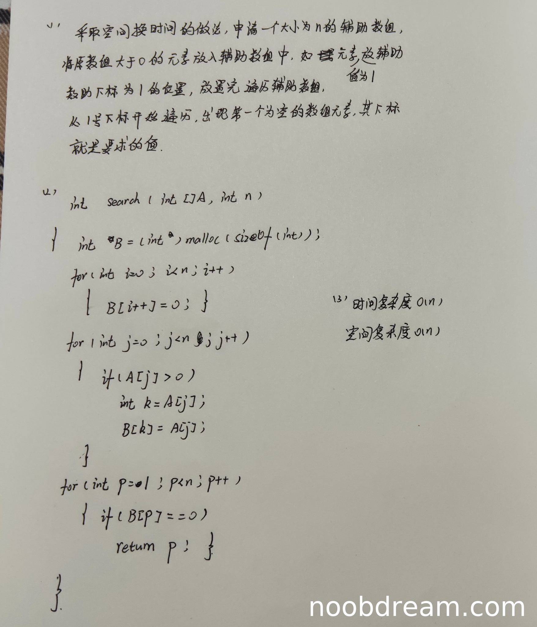 2. 边界条件处理不完整:代码中 `for(int p = 1; p < n; p++)` 遍历辅助数组 B 时,下标从 1 到 n-1。如果数组 A 中包含了 1 到 n 的所有正整数,那么 B[1] 到 B[n-1] 都不为 0,循环结束后函数没有返回值(缺少 `return n+1;` 或类似语句),这会导致未定义行为。