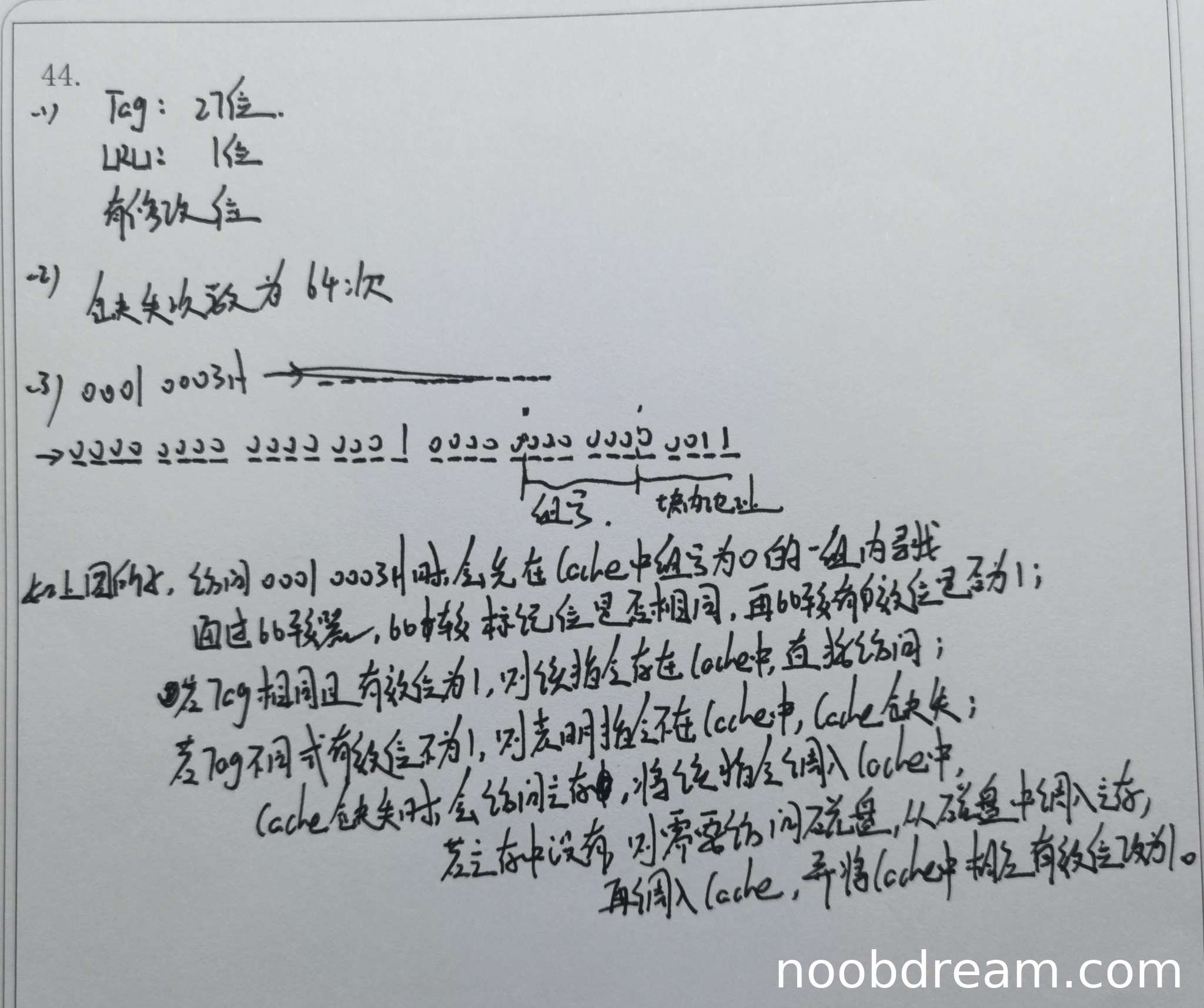学生答案中Tag给出27位,LRU给出1位,并说有修改位。标准答案中Tag应为20位,LRU应为3位,且采用直写策略故无修改位。学生答案在关键参数上全部错误,但考虑到可能存在识别错误(如“27”可能是“20”的误写,“1位”可能是“3位”的误写),且“有修改位”是明确的逻辑错误。综合判断,核心逻辑错误,扣分。得0分。