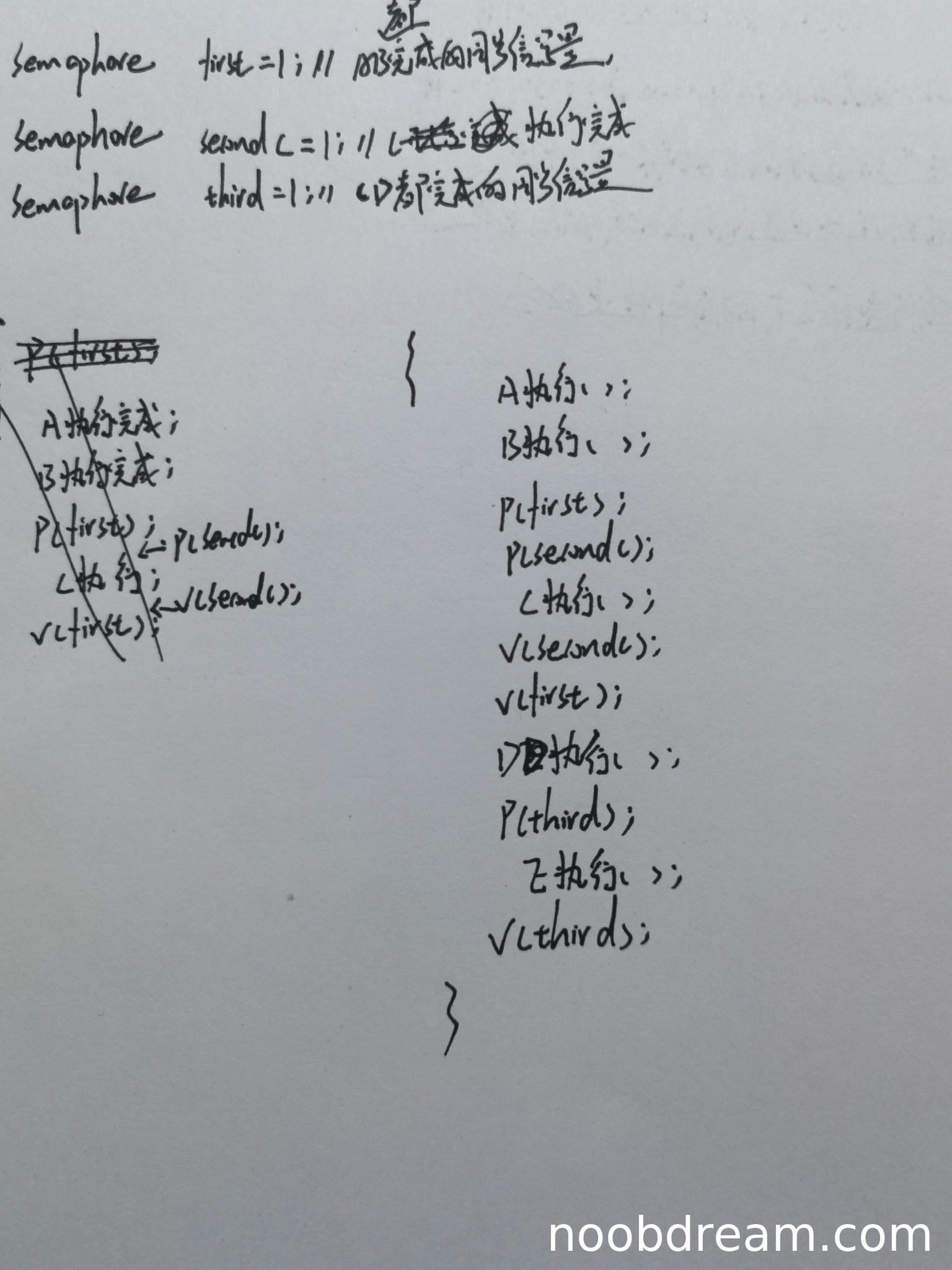 first和secondc执行了P操作,但这两个信号量在A和B执行后并没有对应的V操作来通知C(代码中A和B只是简单地执行,没有信号量操作)。同样,E执行前对third执行了P操作,但D执行后也没有对应的V操作。因此,同步约束完全失效。