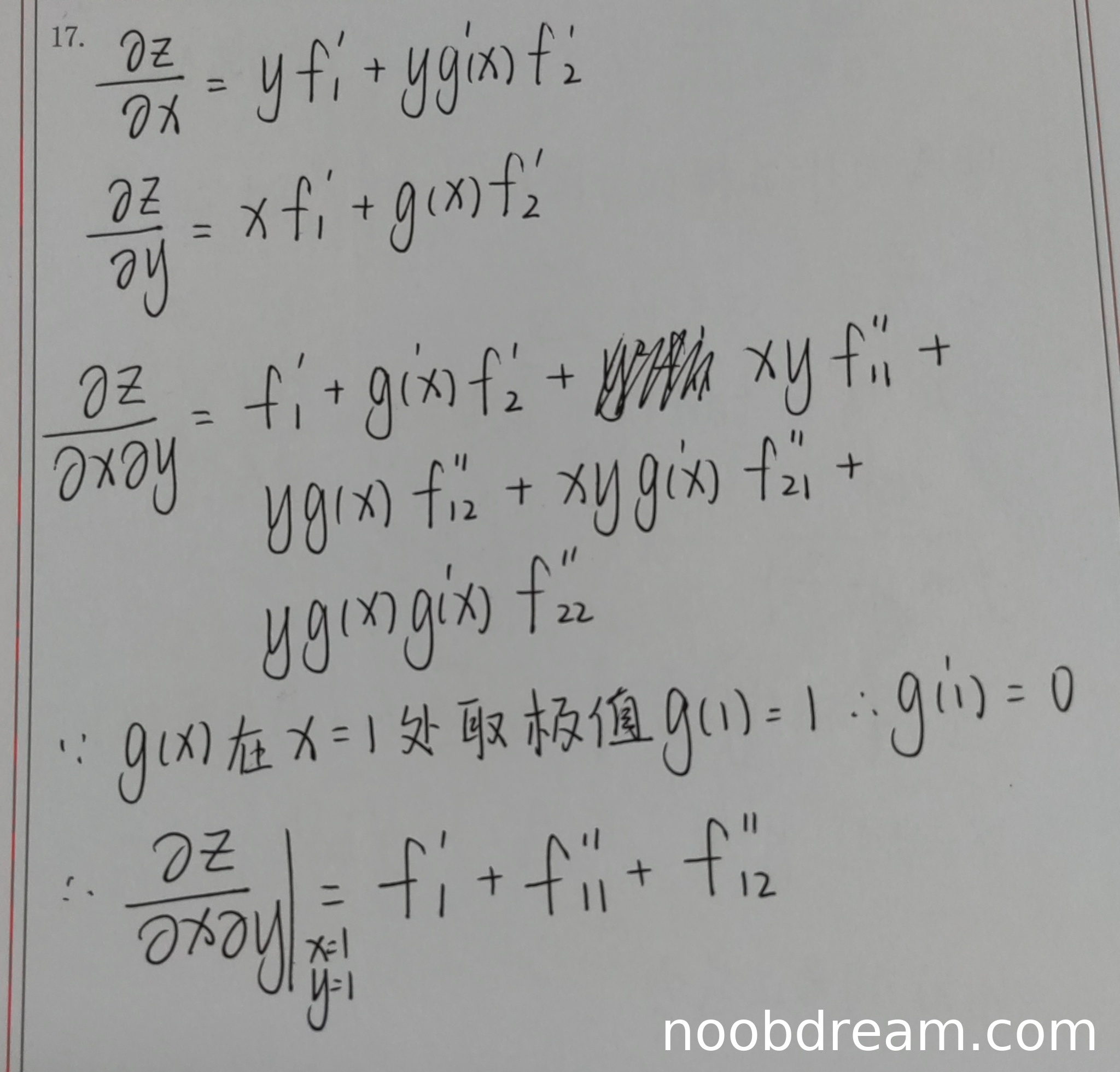 尽管后续正确利用了 \(g'(1)=0\) 和 \(g(1)=1\) 的条件,但由于二阶偏导表达式本身错误,代入后得到的结果 \(\left.\frac{\partial^{2}z}{\partial x\partial y}...