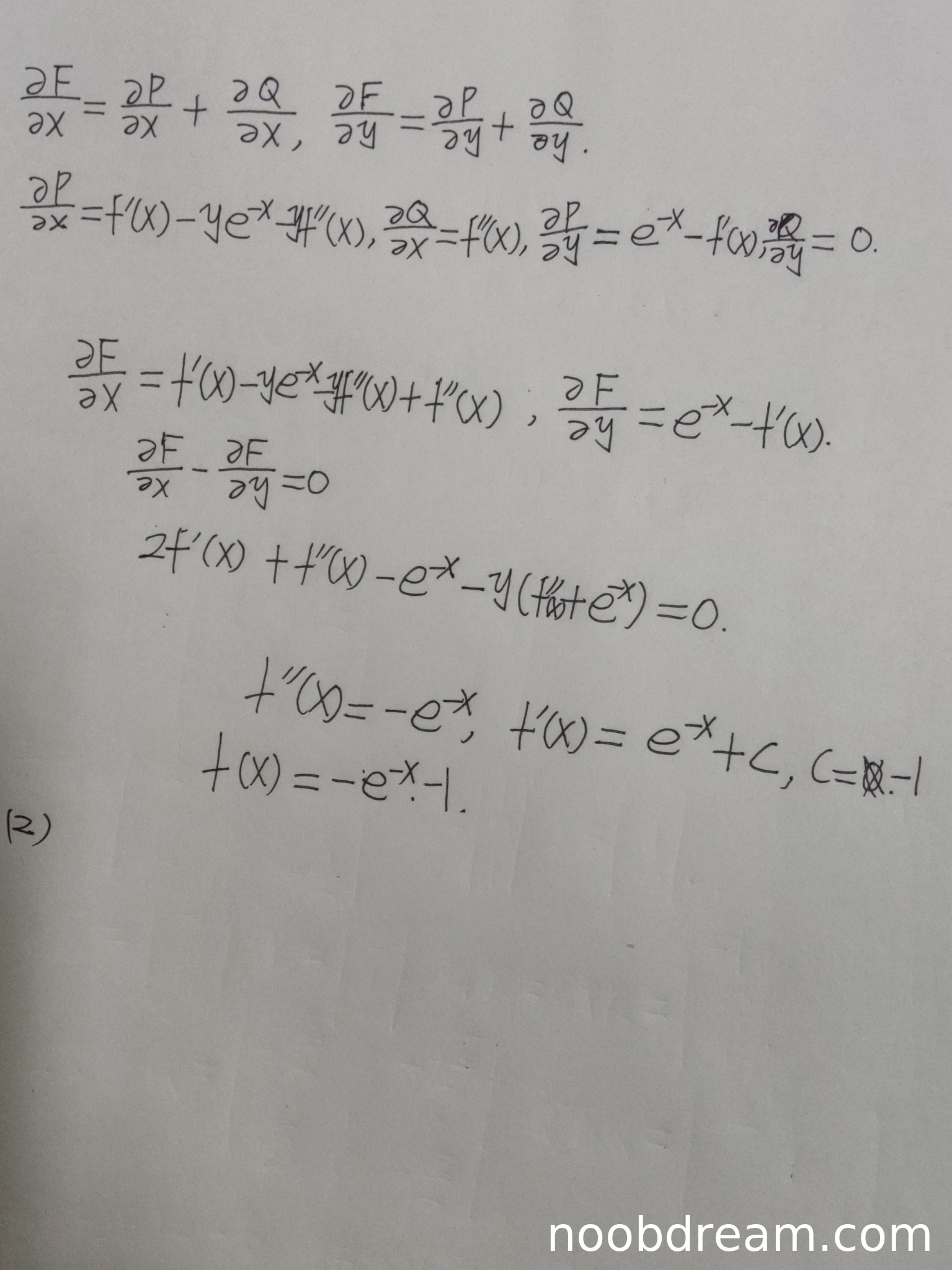 学生作答中,第一次识别结果和第二次识别结果均存在逻辑错误。正确思路应为:由功与路径无关的条件得到 \(\frac{\partial Q}{\partial x} = \frac{\partial P}{\partial y}\),即 \(f''(x) = e^{-x} - f'(x)\)。学生错误地引入了 \(\frac{\partial F}{\partial x}\) 和 \(\frac{\partial F}{\partial y}\) 的概念(力场 \(\boldsymbol{F}\) 的偏导数无直接定义),并错误地令 \(\frac{\partial F}{\partial x} - \frac{\partial F}{\partial y} = 0\),导致推导出的微分方程 \(f''(x) = -e^{-x}\) 是错误的。虽然最终形式上得到了一个 \(f(x) = -e^{-x} - 1\),但该函数不满足 \(f'(0)=0\)(计算得 \(f'(0)=1\)),且不满足原微分方程。因此,本题核心条件未正确使用,微分方程建立错误,后续求解即使积分正确,也因起点错误而全错。扣6分。