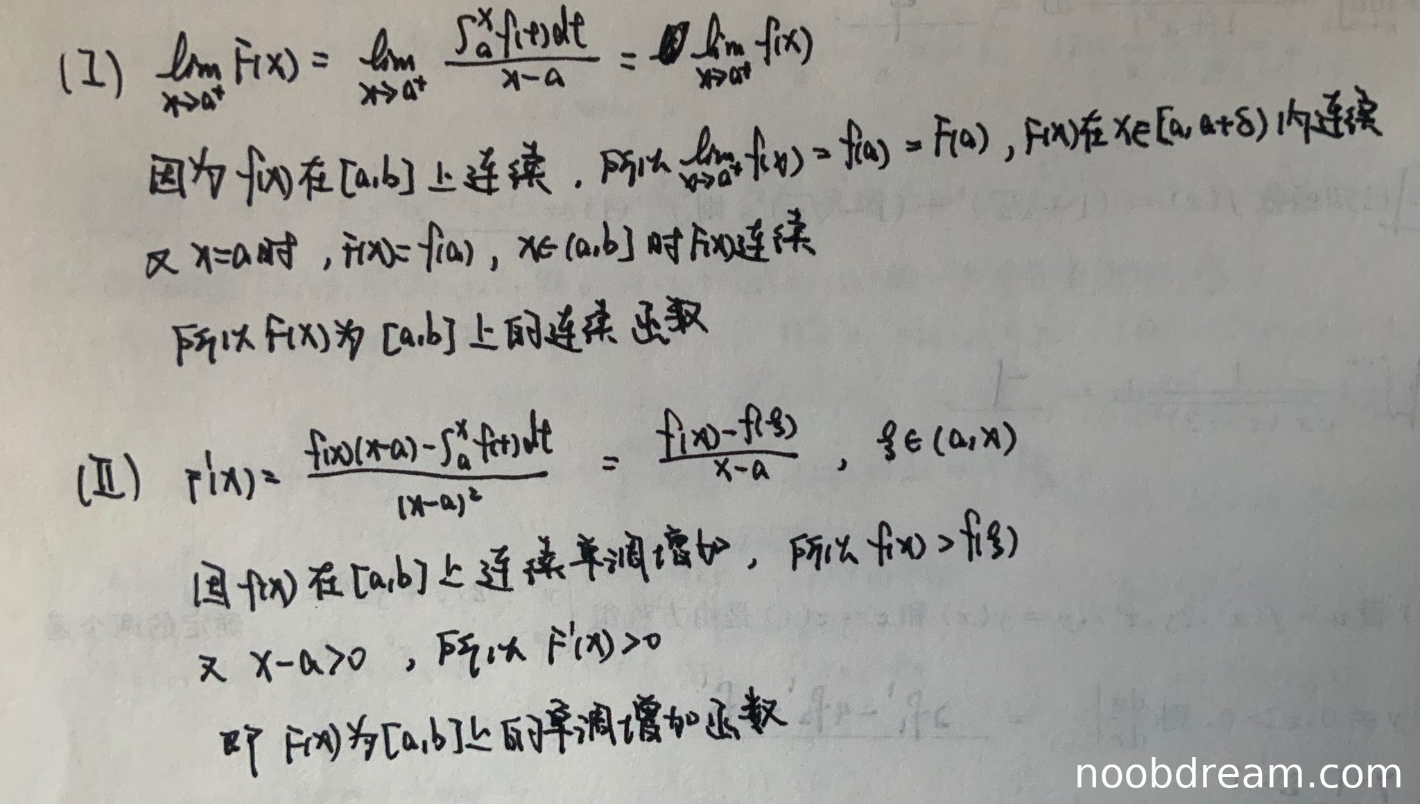 1. 正确部分:学生正确计算了 \(F'(x)\) 的表达式 \(\frac{f(x)(x-a)-\int_a^x f(t)dt}{(x-a)^2}\),并试图利用积分中值定理将其化为 \(\frac{f(x)-f(\xi)}{x-a}\)。认识到 \(f(x)\) 单调增加意味着 \(f(x) > f(\xi)\),且 \(x-a>0\),从而得出 \(F'(x) > 0\) 的结论。这个思路在本质上能导向正确结论。