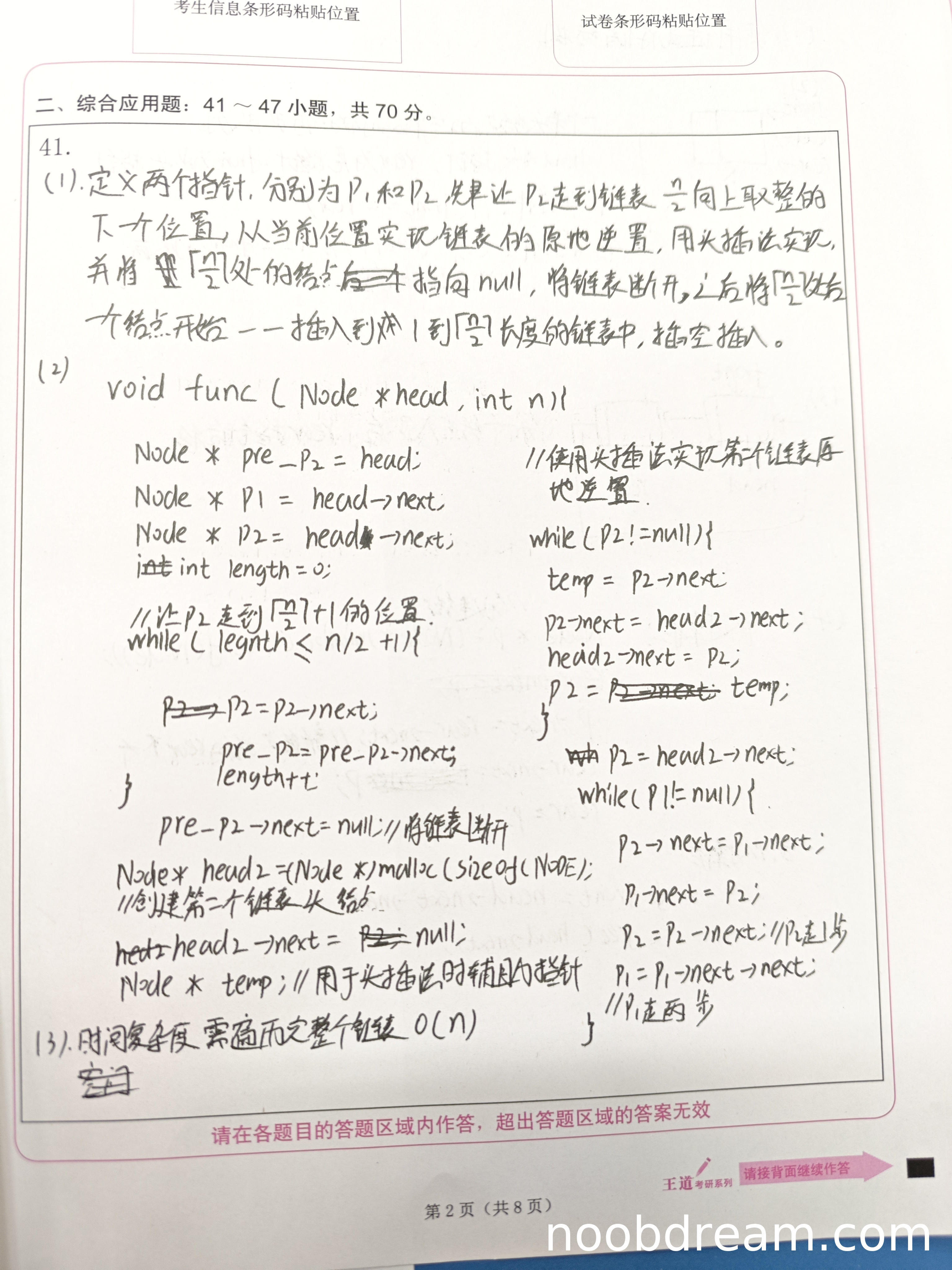 理由:学生的基本设计思想与标准答案基本一致,即找到链表中间点、将后半部分反转、然后合并。但描述中存在一些不准确之处:①“P2走到链表 ⌈n/2⌉ 向上取整的下一个位置”表述不够清晰,实际上应该是找到中间结点(下中位数)并断开;②“用头插法实现链表的原地逆置”可以接受,但未明确说明是对后半段进行反转;③“插空插入”描述了合并过程。整体思路正确,但细节描述不够精确,扣1分。