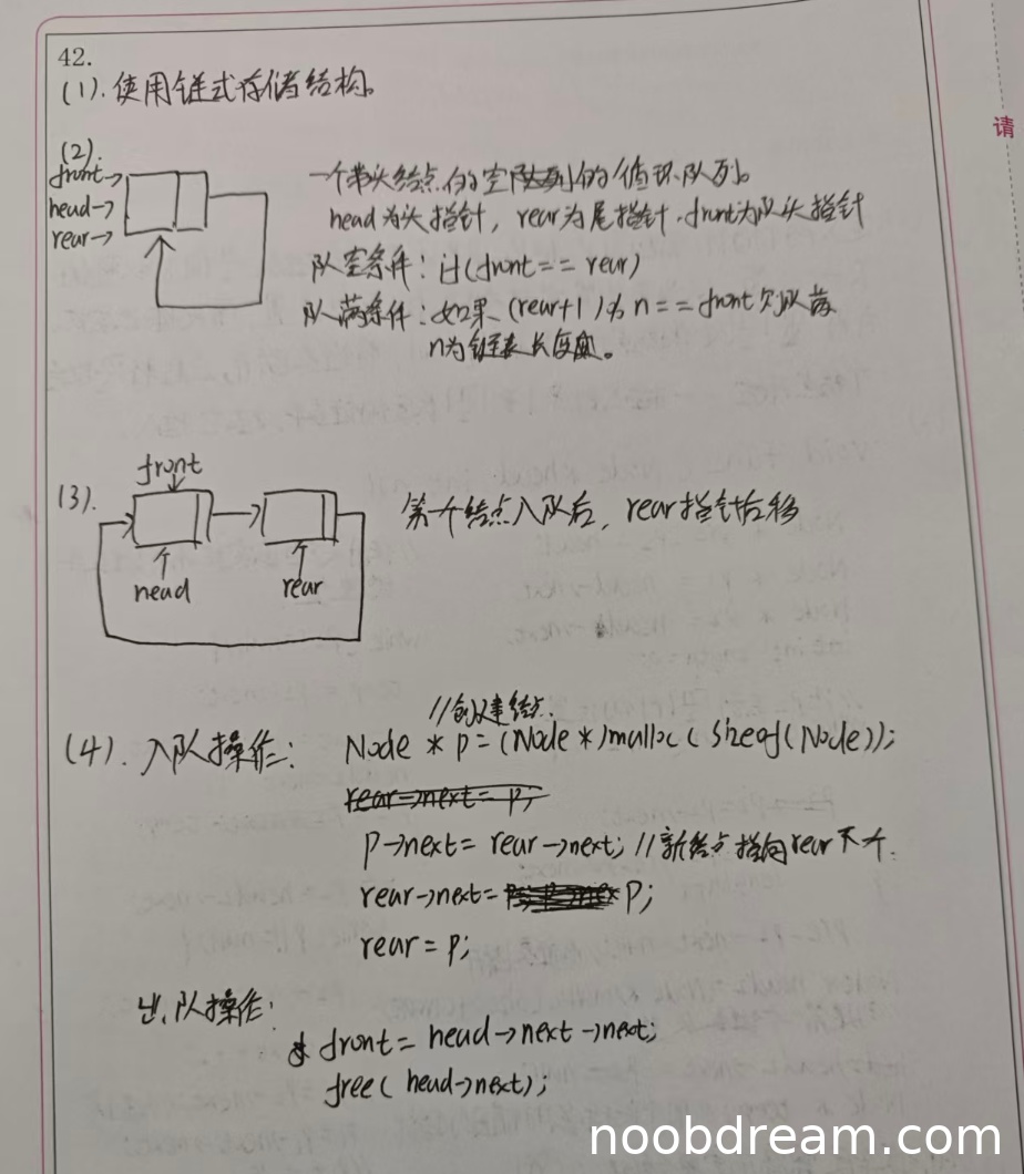 学生的入队操作代码存在逻辑错误:`p->next = rear->next;` 和 `rear->next = p;` 这两句顺序导致`p->next`指向了自身(执行`rear->next = p;`前,`rear->next`可能是旧结点或NULL,但紧接着`rear->next = p;`使得`p->next`在上一句被赋值为`rear->next`后,`rear->next`又变成了`p`,这会造成`p->next = p`的循环,除非`rear->next`原本不是`p`,但在此上下文联立看是错误逻辑)。正确的链式入队应为新结点`p`的`next`指向头结点或队首以维持循环(或置为NULL再在满时调整),然后原尾结点`rear`的`next`指向`p`,最后`rear`指向`p`。学生代码逻辑混乱。出队操作代码 `front = head->next->next; free(head->next);` 也未能正确体现从`front`所指位置...