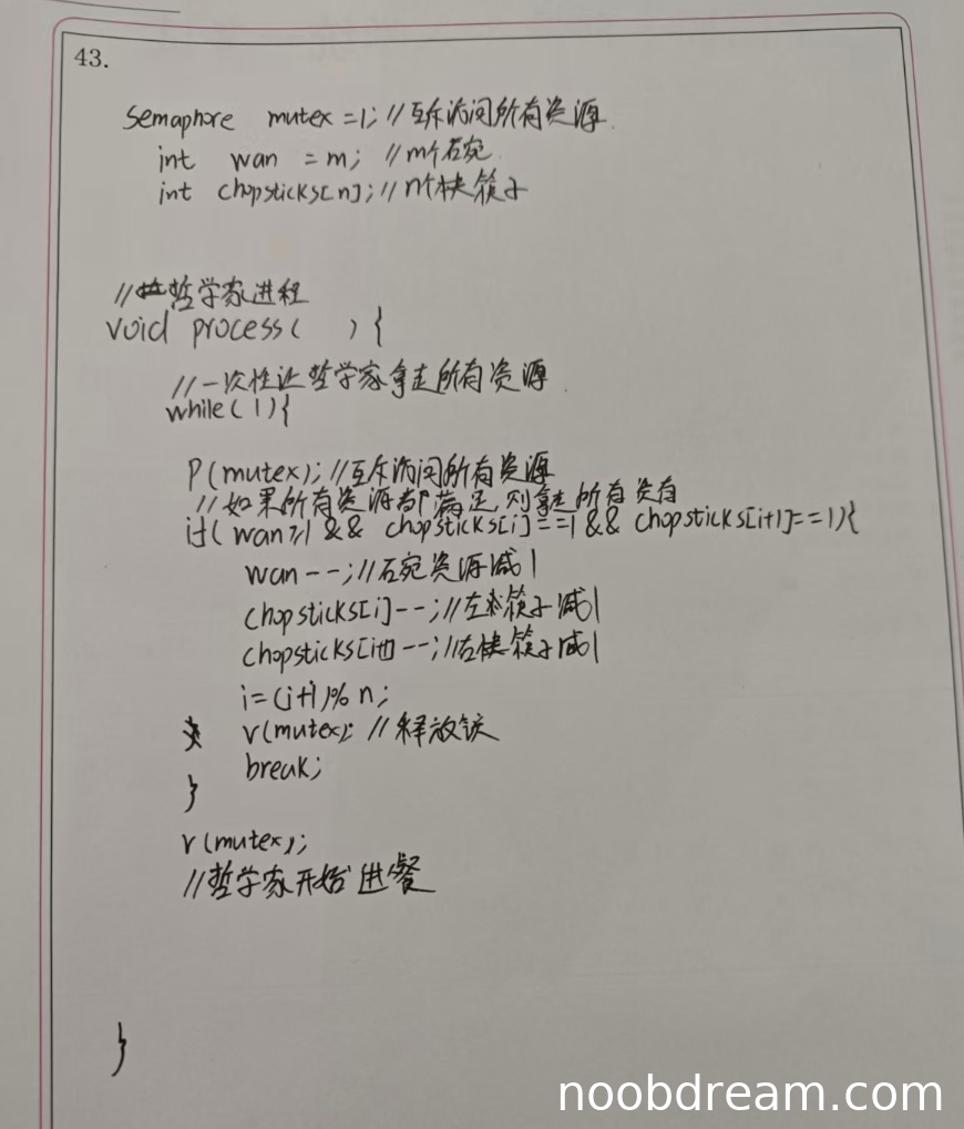 - 给分点:学生答案中正确识别了需要碗和左右两根筷子(共三种资源),并且使用了互斥的思想来防止竞态条件。鉴于其基本理解了问题涉及多种资源,但解决方案存在上述根本性逻辑错误,无法正确实现同步与防止死锁,因此给予少量分数。