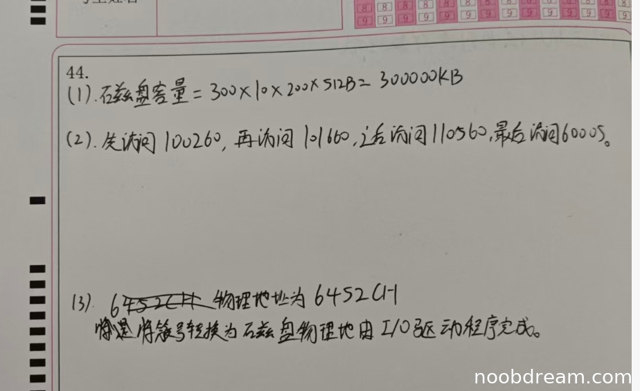 第一问:学生两次识别的答案分别为“6452CH”和“6452C - 1”,这明显不是标准答案所要求的“柱面号、磁道号、扇区号”形式的物理地址。学生答案可能是将簇号转换成了某种线性地址或存在识别错误,但无论如何,其答案不符合题目要求,也未展示计算过程,因此第一问不得分。