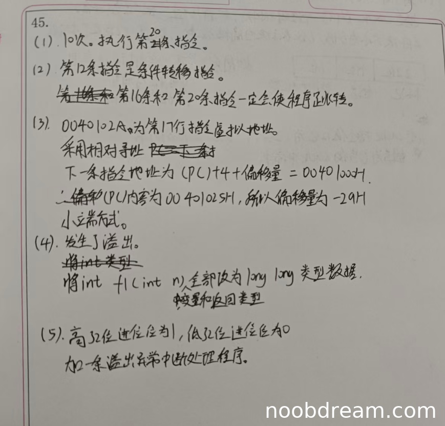 第二问:偏移量是多少?学生回答“-29H”,计算过程有误。其描述“下一条指令地址为(PC)+4+偏移量=00401004H”与标准计算不符。正确偏移量应为FFFFFFD6H。扣1分。