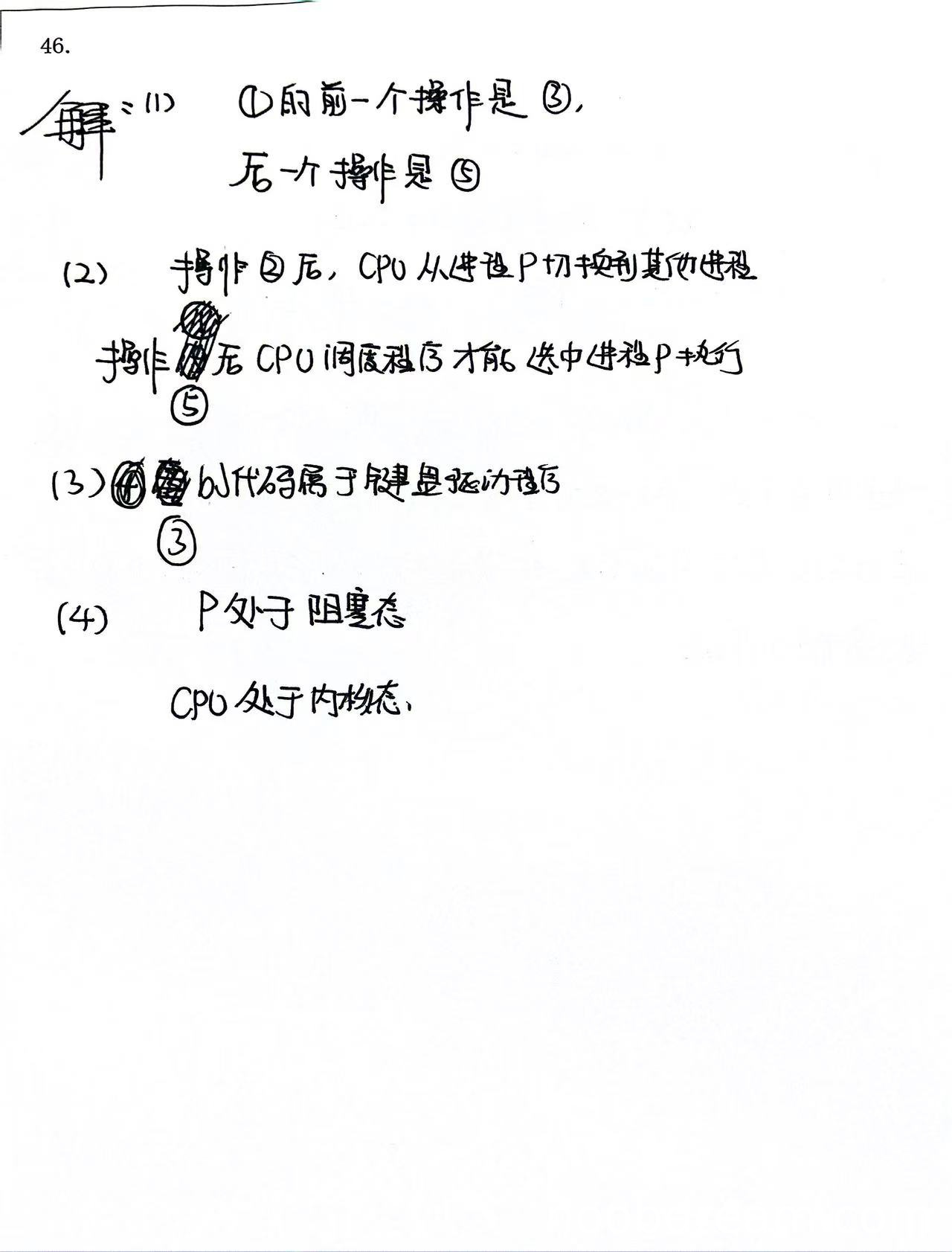 学生答案的第一部分(操作②后,CPU从进程P切换到其他进程)与标准答案完全一致,得1分。