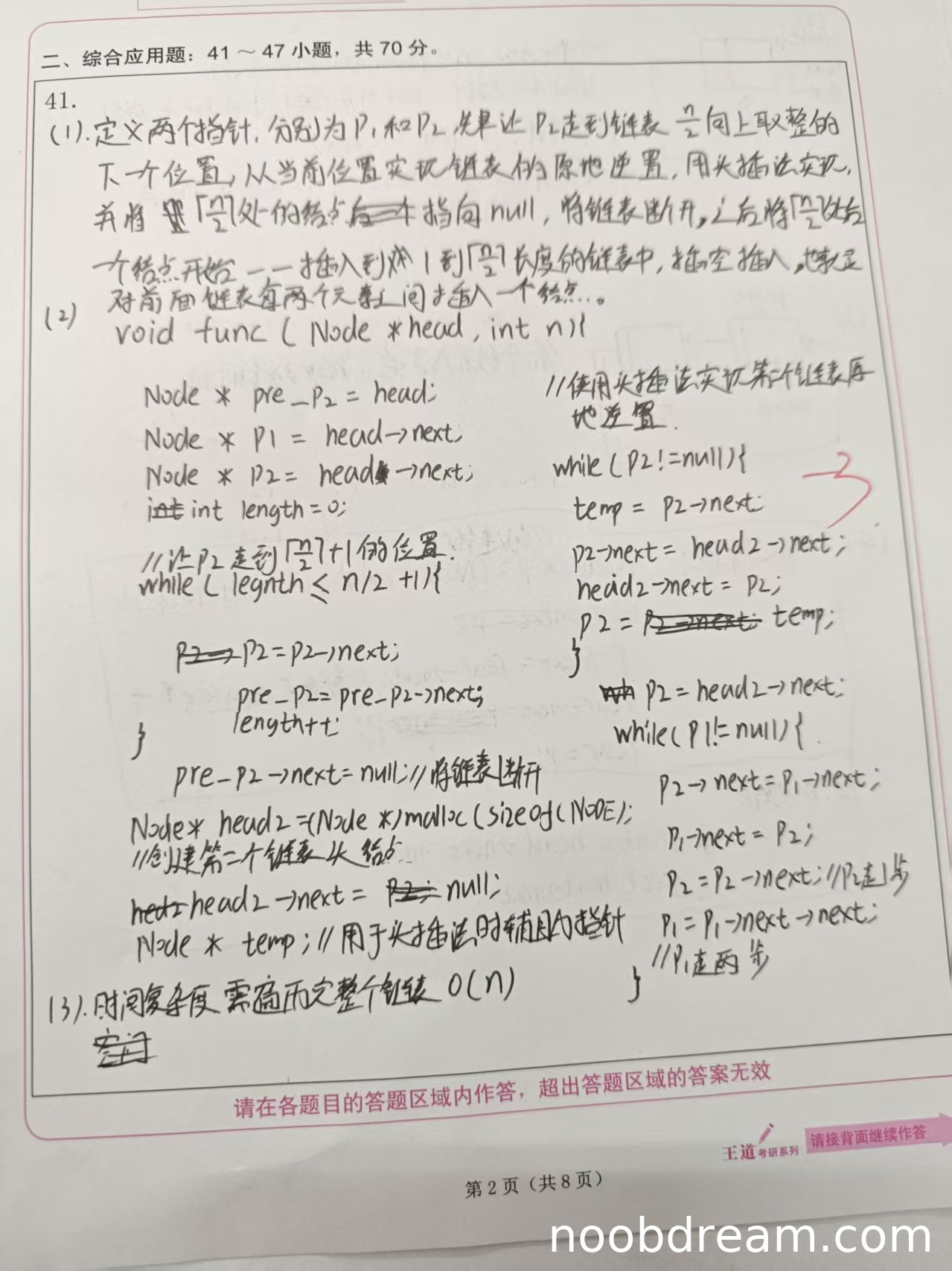 2. 在寻找中间结点的循环中,条件为 length <= n/2 +1,且初始 length=0,这样会导致 P2 实际移动到第 floor(n/2)+2 个结点(当 n 为偶数时可能越界),而不是正确的中间结点或后半段起点。这是一个严重的逻辑错误,扣2分。