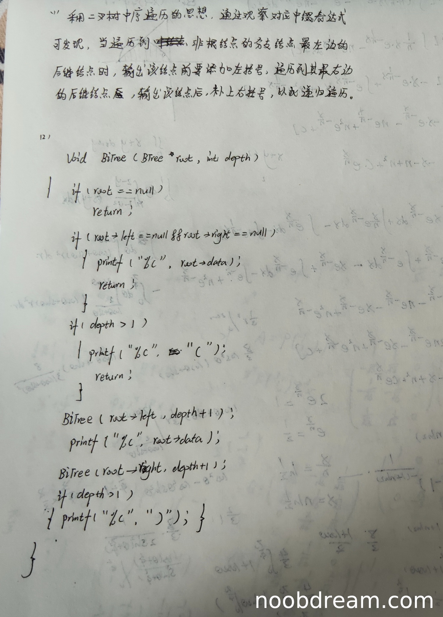 depth > 1时输出左括号后直接return,这会导致递归提前终止,无法继续遍历左右子树,属于严重逻辑错误。Bree应为BTree),但根据上下文判断为识别误写,不扣分。%c,但data字段是字符串(char[10]),应使用%s,这会导致输出错误,属于逻辑错误。由于存在两处关键逻辑错误(提前返回和格式符错误),扣分应较重。但考虑到学生思路正确,代码结构基本符合要求,给予部分分数。