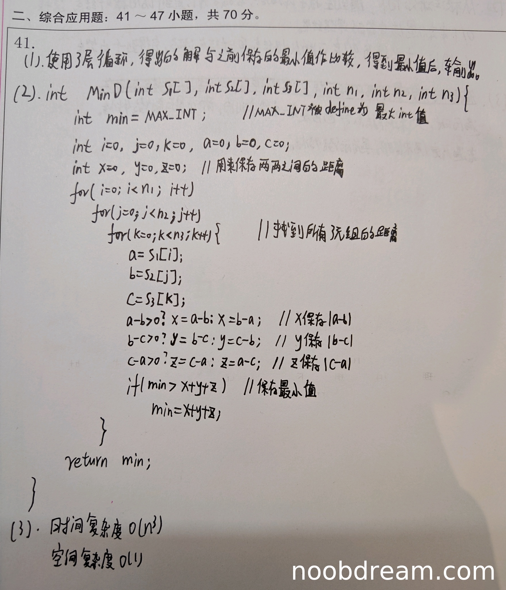 学生给出的基本设计思想是“使用3层循环,得出的解与之前保存的最小值作比较,得到最小值后,输出”。这描述的是暴力枚举所有三元组的方法。虽然思路简单,但符合题目要求“设计一个尽可能高效的算法”中的基础解法,且思想表述清晰。因此,本部分得3分。