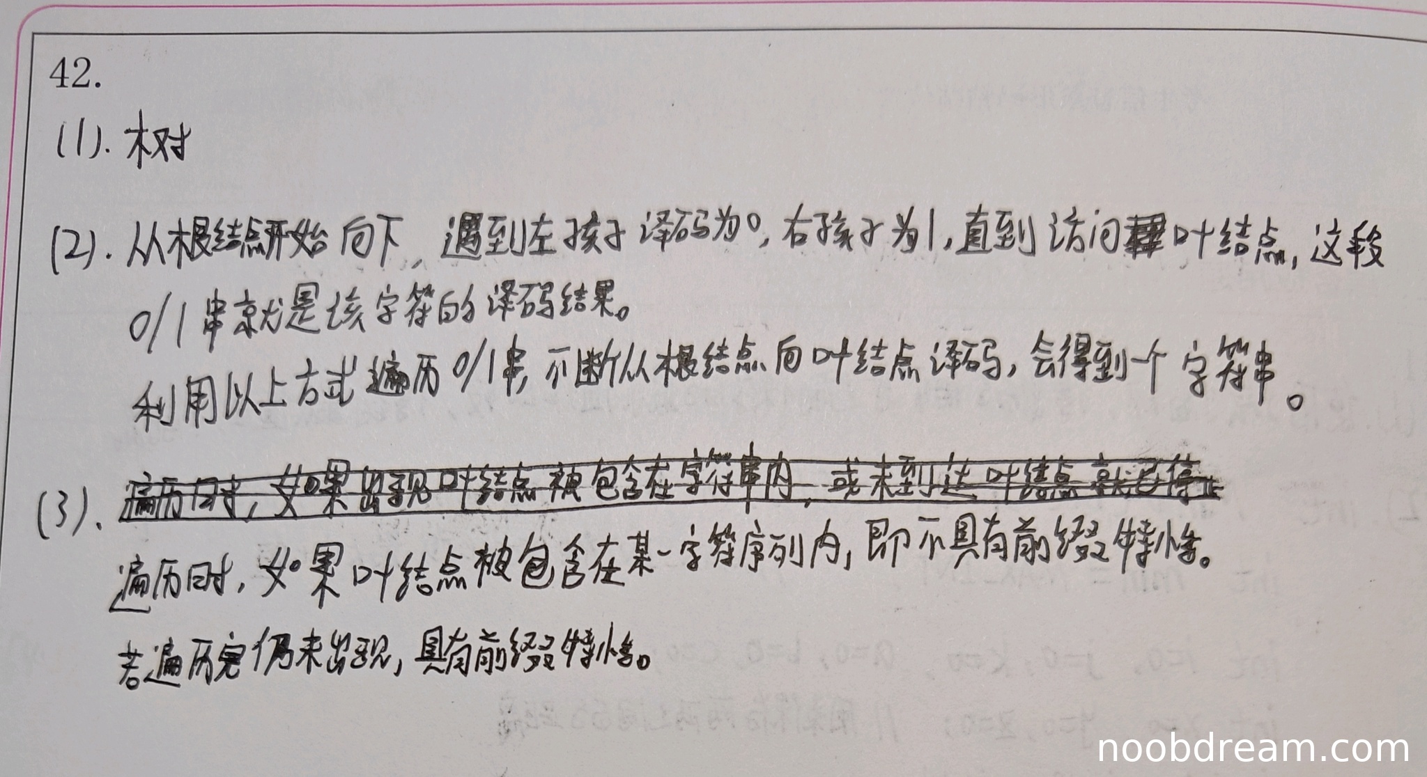 学生回答“遍历树时,如果叶结点被包含在某一字符序列内,即不具有前缀特性。若遍历完仍未出现,具有前缀特性。”此表述不清晰且存在逻辑错误。“叶结点被包含在某一字符序列内”语义模糊,标准判定方法是检查编码是否对应树的叶结点,以及是否有编码对应内部结点。学生答案未能准确描述判定过程,因此扣分。得1分。