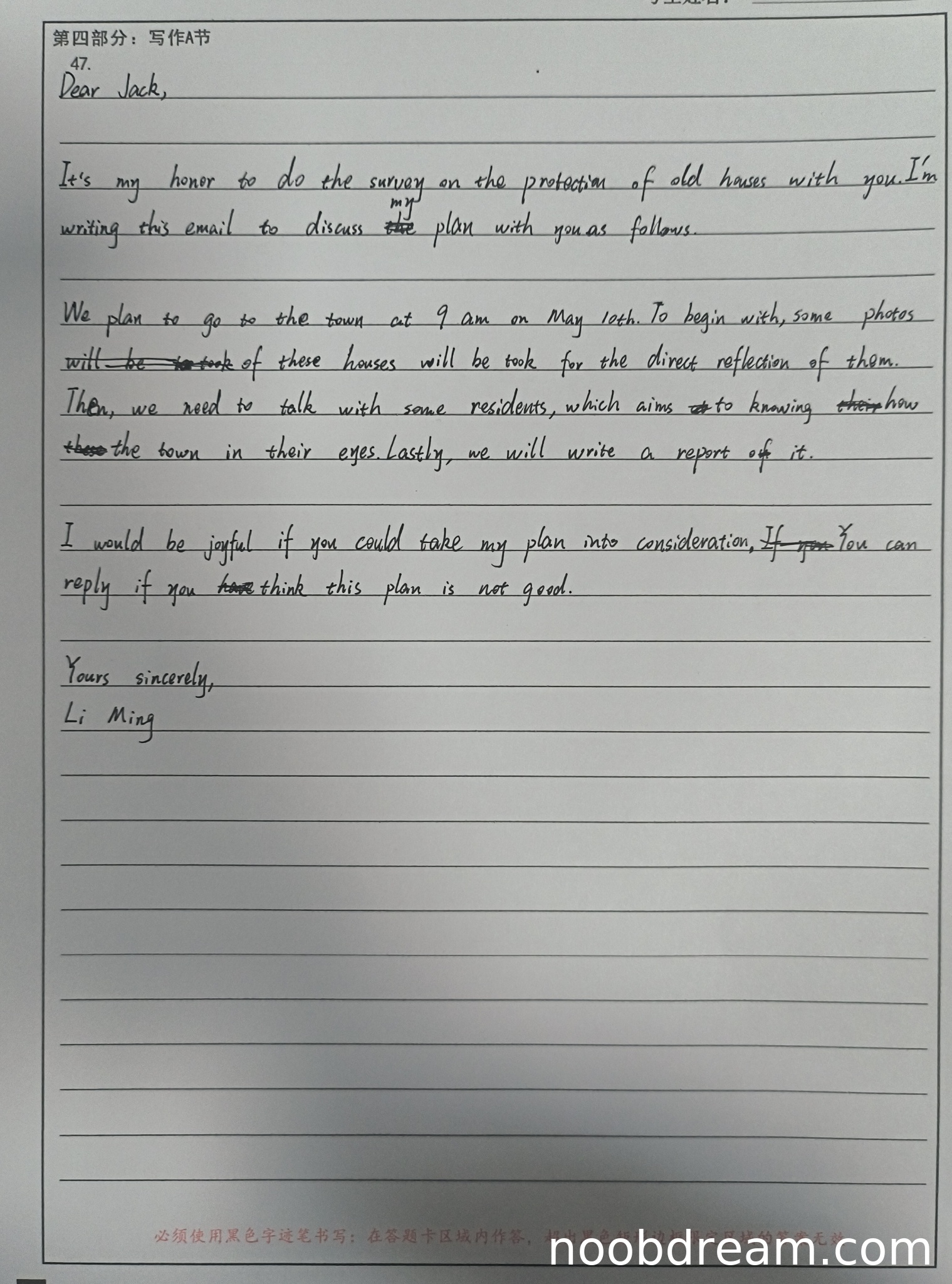 根据题目要求,这是一封电子邮件,需要完成两个要点:1) 提出你的计划;2) 征求对方的意见。学生的作答(以第二次识别结果为准)内容完整,覆盖了所有要点:明确提出了调查的时间、步骤(拍照、访谈居民、撰写报告)等计划,并在结尾处征求对方意见(“You can reply if you think this plan is not good.”)。语言流畅自然,语法和词汇错误极少(如“how they see the town in their eyes”略显冗余,但意思清晰,不影响理解)。格式正确,包含称呼、正文、结尾敬语和署名,语域(朋友/同事间的非正式沟通)恰当。逻辑清晰,衔接紧密。因此,该作答符合第五档(优秀)的标准。