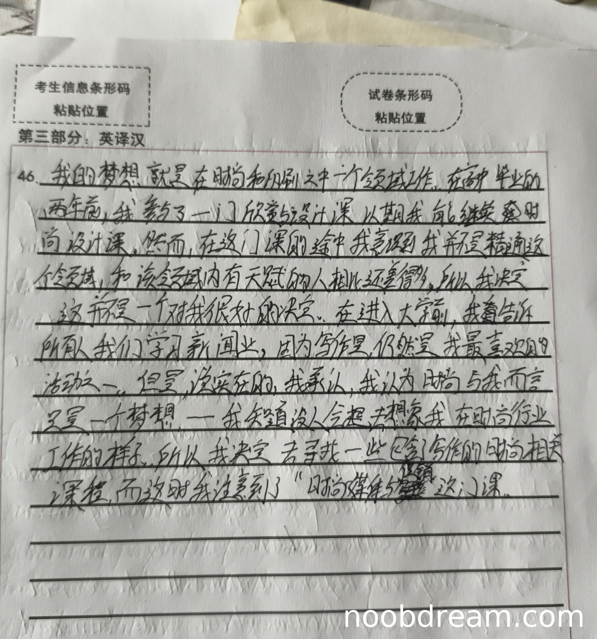 学生翻译整体上准确传达了原文的主要信息和逻辑脉络。存在几处与标准答案有出入的地方,但根据“禁止扣分”原则,部分差异可能源于识别错误(如“印刷”与“出版”、“欣赏”与“缝纫”、“营销”与“推广”),且不影响核心逻辑,因此不扣分。然而,“我并不是精通这个领域,和该领域内有天赋的人相比还差得多”这一表述,虽然意思接近,但相较于标准答案“我意识到自己在这个领域不够出色,因此不足与其他有创造力的人士竞争”,在“不足与...竞争”这一关键逻辑点的传达上不够精准和直接,存在轻微的语义弱化。综合考虑翻译的准确性、流畅度及这一处可辨识的逻辑表达偏差,给予扣分。最终得分:13分。