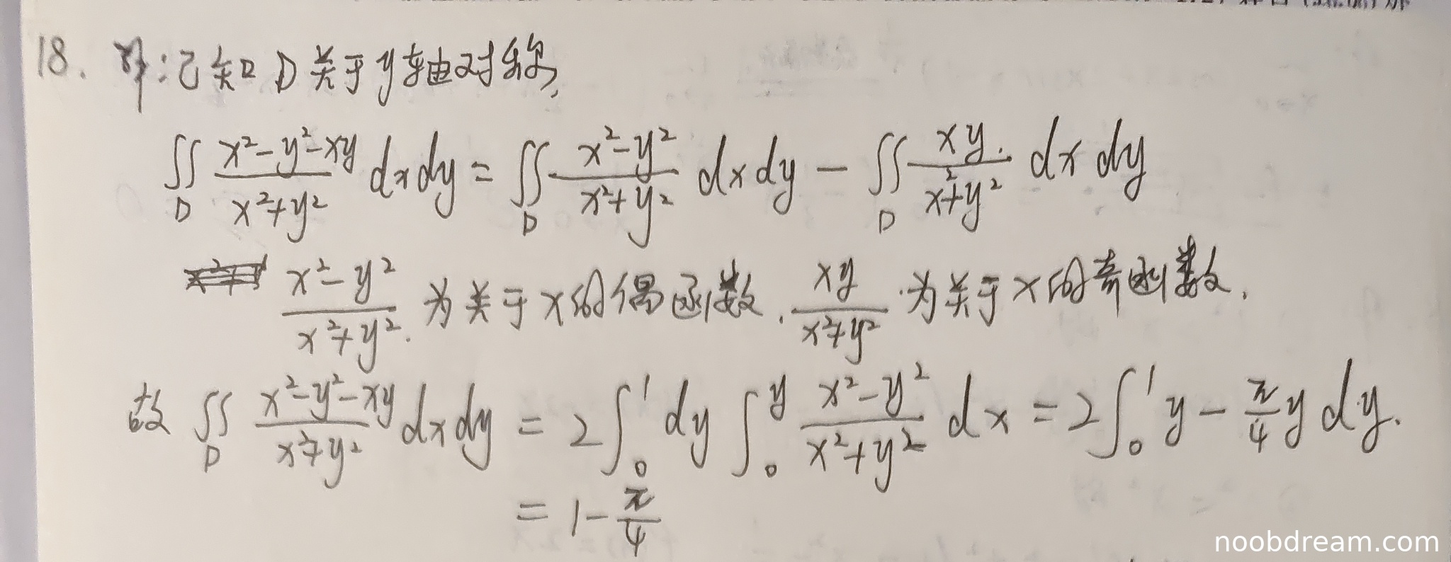 - 而标准答案中对应部分(即 \(I_1\) 中的 \( -2\iint_{D} \frac{y^2}{x^2+y^2} dxdy \) 在半区域上计算)得到的是 \(\frac{\pi}{4} y\),因此整个被积函数在半区域上的积分应为 \(y - 2 \cdot \frac{\pi}{4} y = y - \frac{\pi}{2} y\),这与学生得到的内层积分表达式一致。