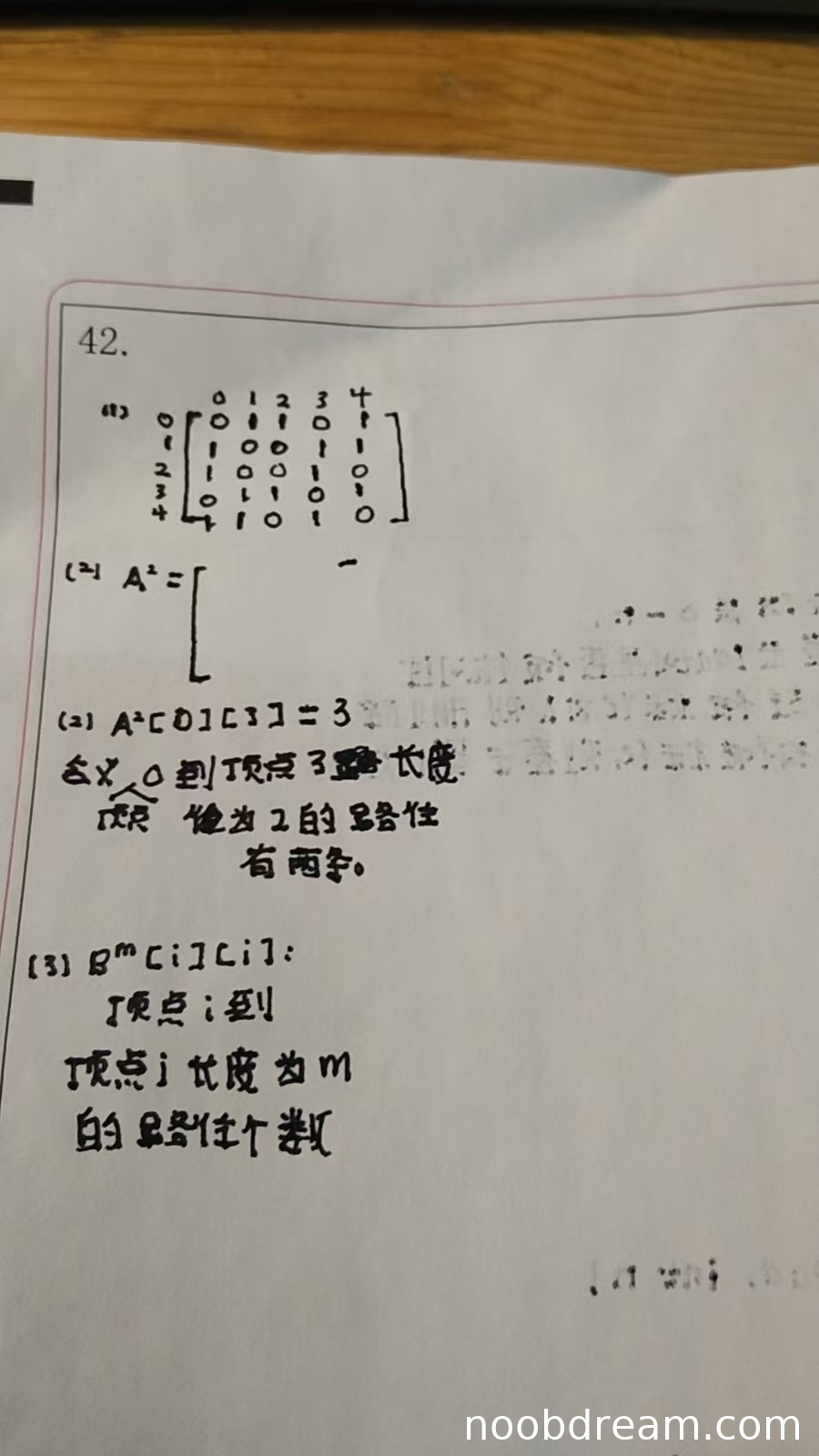 学生未完整写出 \(A^2\) 矩阵,但给出了 \(A^2[0][3]=3\) 这一关键元素值,这与标准答案一致。对于该元素含义的解释,第一次识别结果表述为“从0到顶点3的长度顶点权值为2的路径性有两条”,语句不通且结论“两条”错误;第二次识别结果表述为“0到顶点3长度为2的路径有两条”,结论“两条”错误(应为3条)。虽然识别到了关键数值,但对含义的解释存在逻辑错误(数量错误)。因此,给予部分分数。