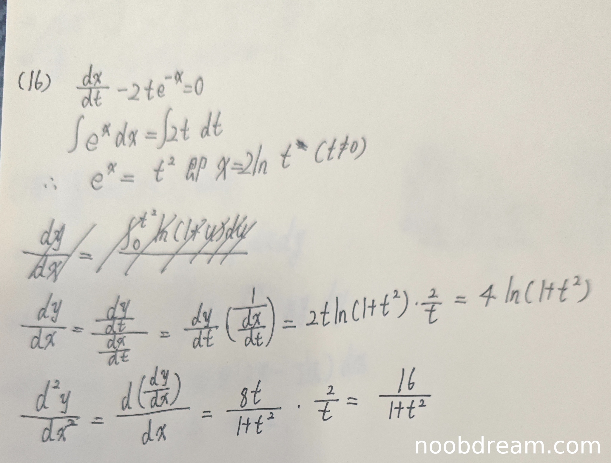 学生正确应用了参数方程求导公式 \(\frac{dy}{dx} = \frac{dy/dt}{dx/dt}\)。计算 \(dy/dt = 2t \ln(1+t^2)\) 是正确的。但由于在(1)中求得的 \(dx/dt = 2/t\) 是基于错误的 \(x(t)\) 表达式,导致后续计算虽然公式应用正确,但基于错误的前提。因此,此部分的计算过程逻辑上依赖于前一步的错误结果,不能给予分数。