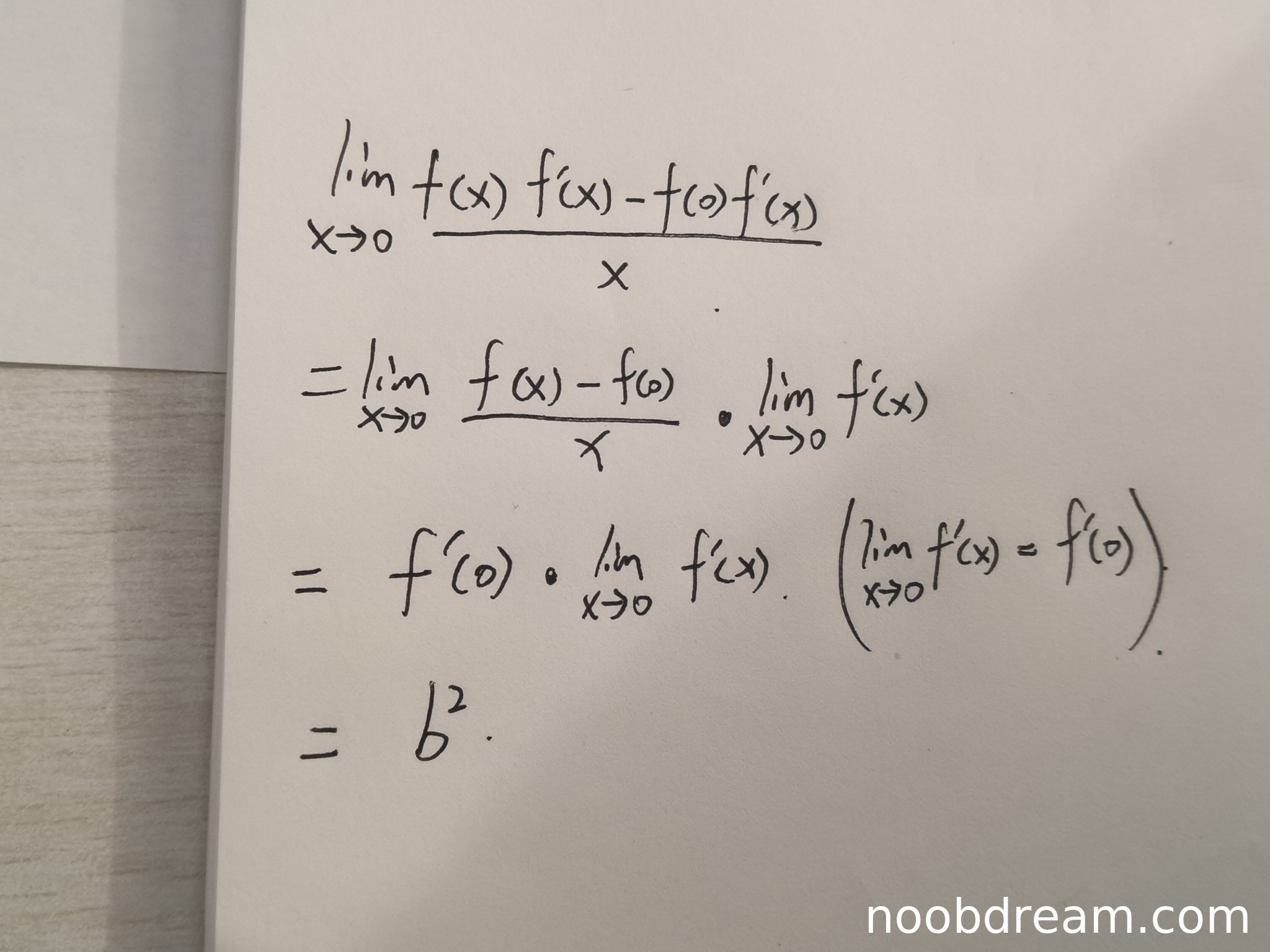 这里存在一个关键的逻辑错误:题目只给出了 \(f'(0)=b\),并未给出 \(f'(x)\) 在 \(x=0\) 处连续的条件。因此,不能由 \(f'(0)\) 存在推出 \(\lim_{x\to 0} f'(x) = f'(0)\)。学生的推导中默认或假设了 \(f'(x)\) 在 \(x=0\) 处连续,这是一个没有依据的额外条件,因此整个推导过程是错误的。