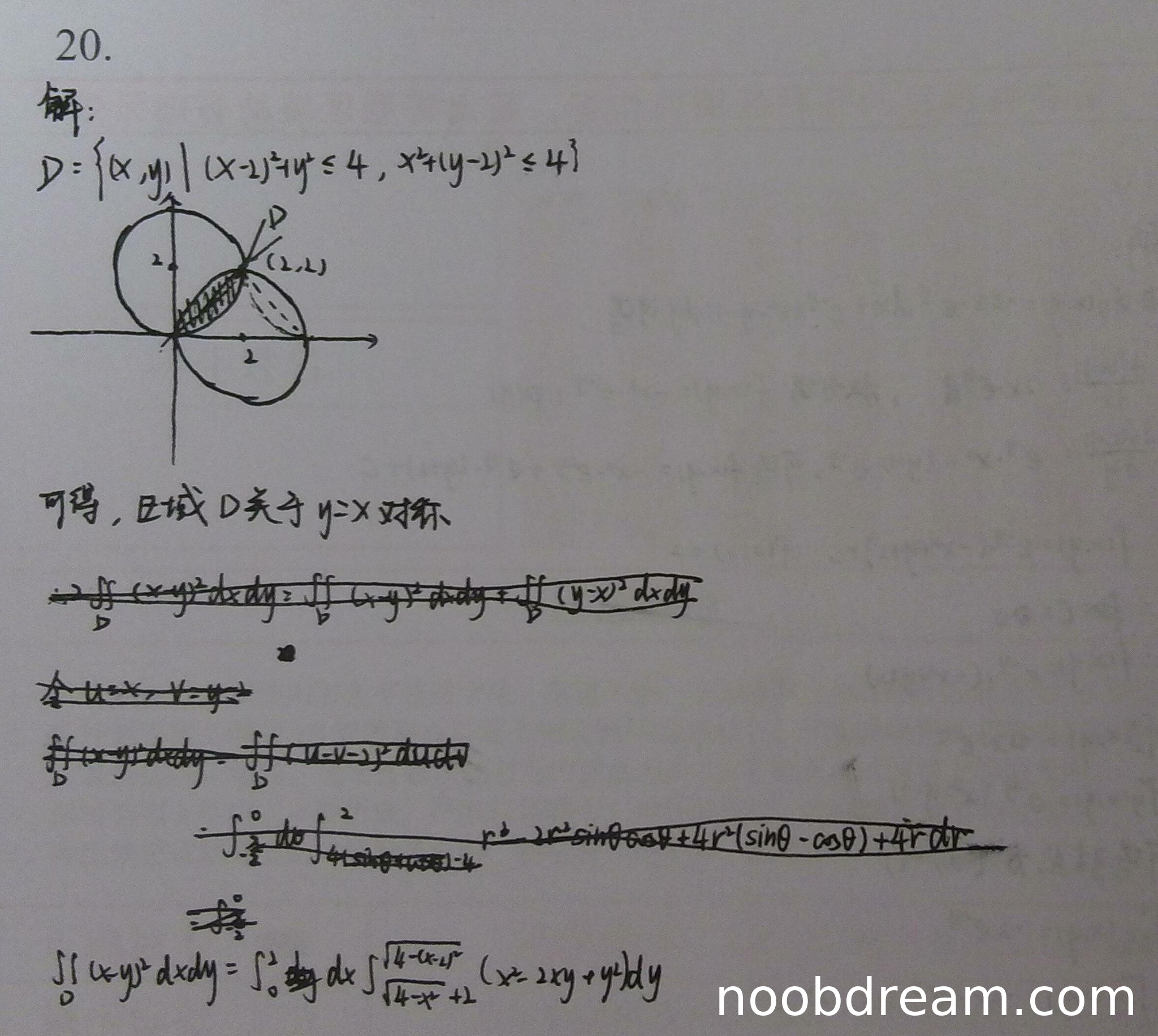 学生作答给出了积分区域 \(D\) 的正确描述 \(D=\{(x,y)|(x - 2)^2 + y^2\leq4, x^2 + (y - 2)^2\leq4\}\),并正确指出了区域关于 \(y = x\) 对称。这是解题的关键第一步,思路正确。