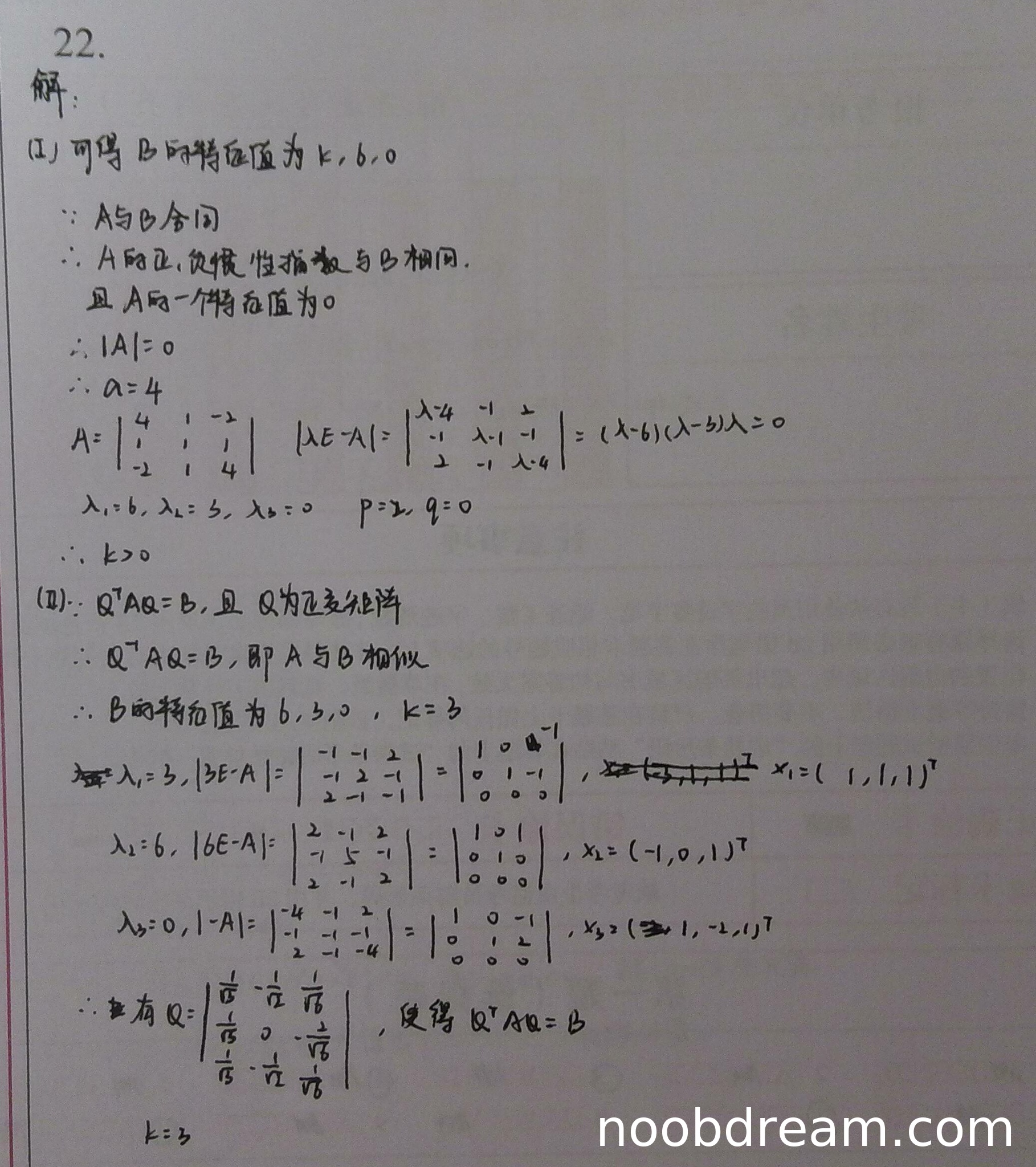 学生正确指出由 Q 为正交矩阵且 Q^TAQ=B 可得 A 与 B 相似,从而特征值相同,因此 k=3。接着分别求出特征值 3,6,0 对应的特征向量,并单位化得到正交矩阵 Q。
