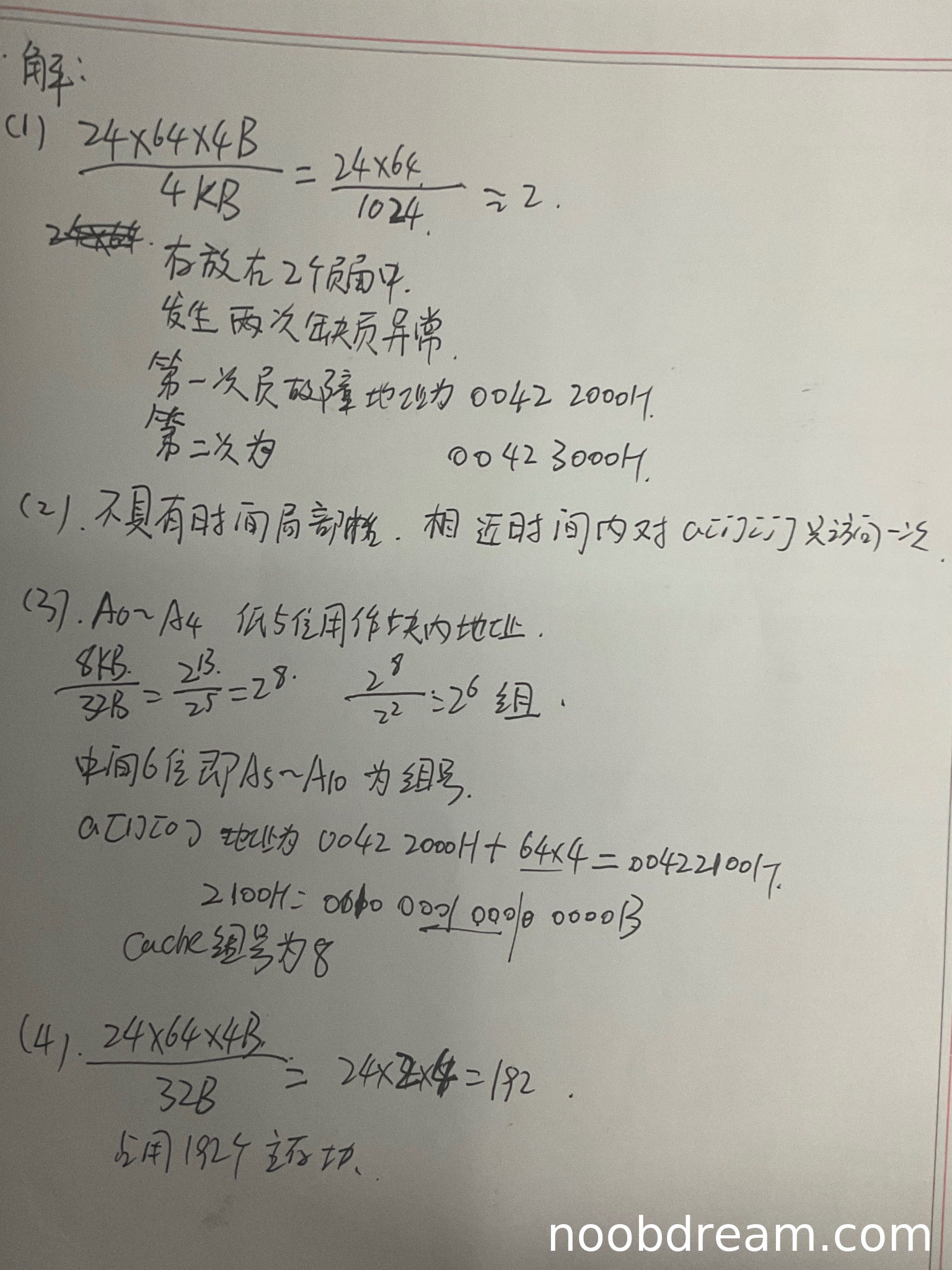 学生正确指出虚拟地址低5位(A0~A4)为块内地址,中间6位(A5~A10)为Cache组号,计算过程正确。a[1][0]的虚拟地址计算正确(0042 2100H)。Cache组号计算过程(2100H二进制分析)正确,得出组号8。得4分。