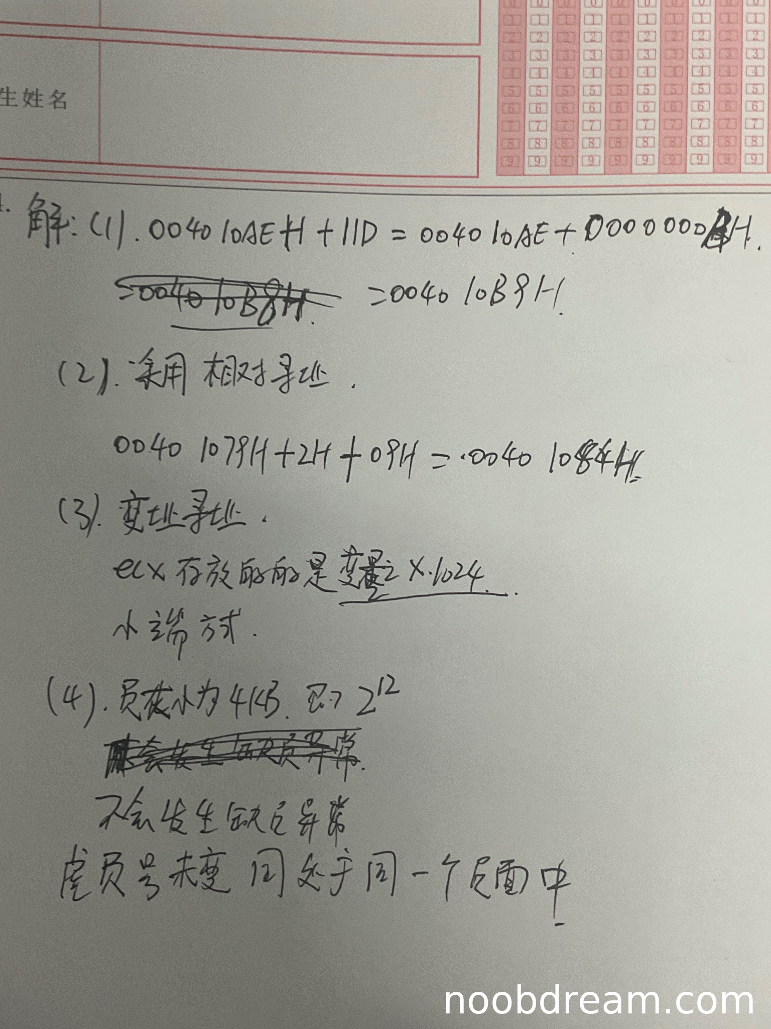 理由:学生正确计算出第20条指令的虚拟地址为004010B9H。虽然第一次识别结果中出现了“0000000H”的笔误,但第二次识别结果正确,且最终答案正确。根据“误写不扣分”原则,不扣分。