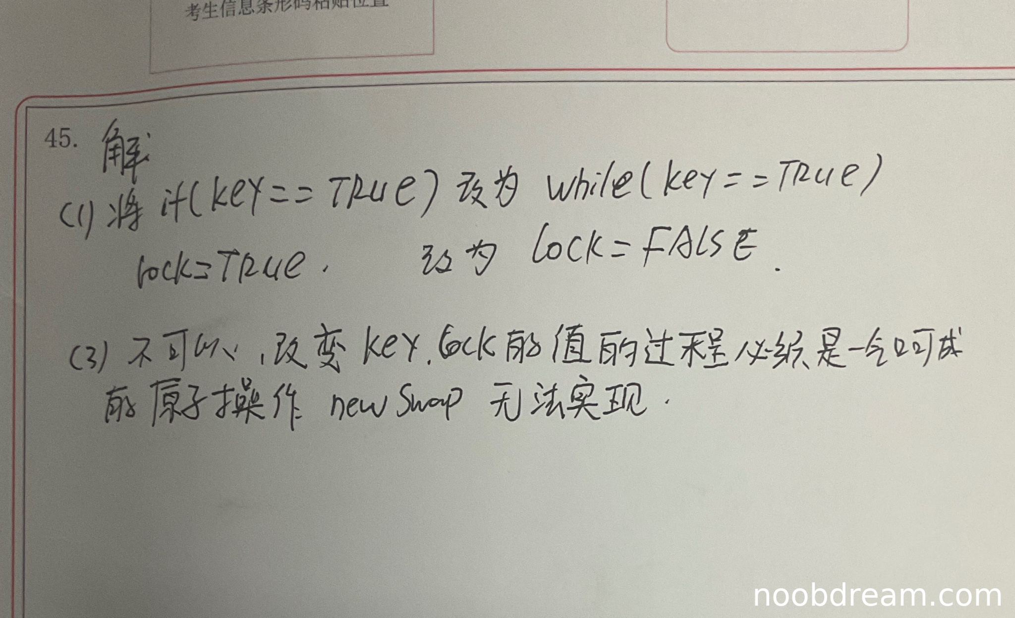 if(key == True) 改为 while(key == True)。这是正确的,因为需要循环等待直到成功获取锁。lock = True; 改为 lock = False;。这是正确的,因为退出临界区后需要释放锁(将lock置为FALSE)。学生的修改与标准答案完全一致,因此该部分得满分。