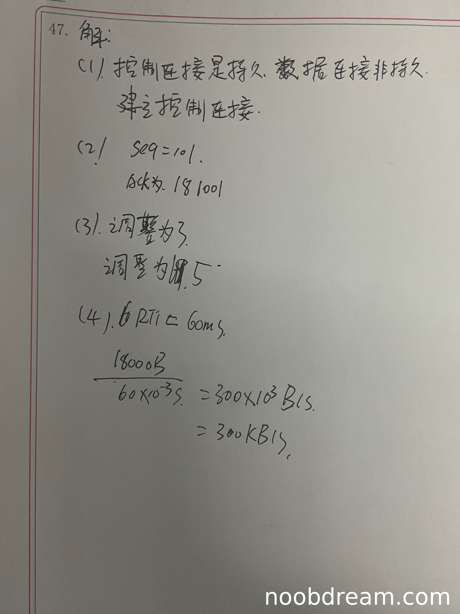 学生答案:RTT = 60ms,速率计算为300KB/s。